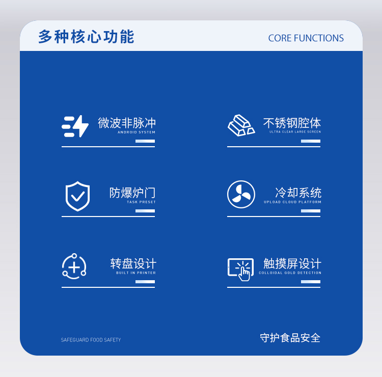 儀器采用微波非脈沖連續(xù)自動變頻控制,延長了儀器的使用壽命和電磁波的均勻性,腔體采用52L大容積316L不銹鋼腔體材料制成,自鎖式緩沖防爆爐門,當反應異常時,緩沖結構確保操作人員人身安全和爐門結構完整無損,爐門和腔體結合緊密,微波泄漏符合國家標準。儀器采用溫、壓雙控系統(tǒng)對消解實驗的壓力和溫度進行控制,實時顯示。360°同向連續(xù)旋轉,微波均勻,確定各個樣品微波環(huán)境相同,提高實驗結果的一致性。當罐內的壓力超過設定的保護值時,微波會自動停止加熱。安全防爆膜具有雙保險功能,當罐內的壓力超過防爆膜所能承受的壓力時,防爆膜先行破裂,氣體瀉出,防止罐體受損和對人體的傷害。
