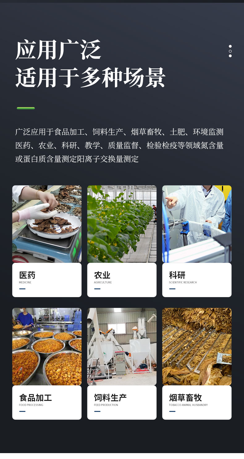 1.廣泛應(yīng)用于食品加工、飼料生產(chǎn)、煙草畜牧、土肥、環(huán)境監(jiān)測、醫(yī)藥、農(nóng)業(yè)、科研、教學(xué)、質(zhì)量監(jiān)督、檢驗(yàn)檢疫等領(lǐng)域氮含量或蛋白質(zhì)含量測定陽離子交換量測定。