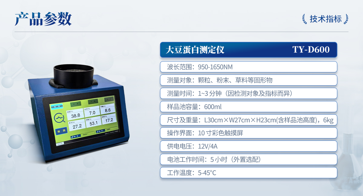 | 波長范圍:950-1650nm | 測量對象:顆粒、粉末、草料等固形物 | 測量時間:1~3 分鐘(因檢測對象及指標(biāo)而異) | 樣品池容量:600ml | 尺寸及重量:L30cm×W27cm×H23cm(含樣品池高度),6kg | 操作界面:10 寸彩色觸摸屏 | 供電電壓:12V/4A | 電池工作時間:5 小時(外置選配) | 工作溫度:5-45℃ |