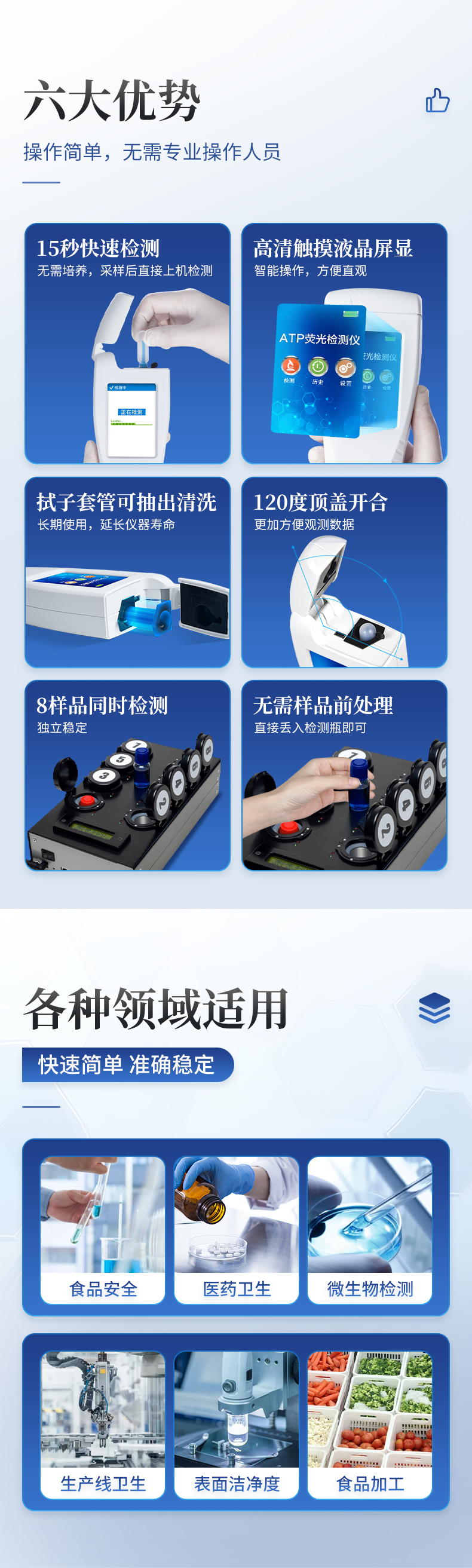天研ATP熒光檢測(cè)儀廣泛應(yīng)用于:細(xì)菌微生物檢測(cè)、醫(yī)藥衛(wèi)生、食品安全、市場(chǎng)執(zhí)法、表面潔凈度檢測(cè)、醫(yī)療防疫、水質(zhì)水政、生產(chǎn)線衛(wèi)生、工業(yè)水處理、環(huán)保檢測(cè)、海關(guān)出入境檢疫及其他執(zhí)法部門(mén)等多種行業(yè)。