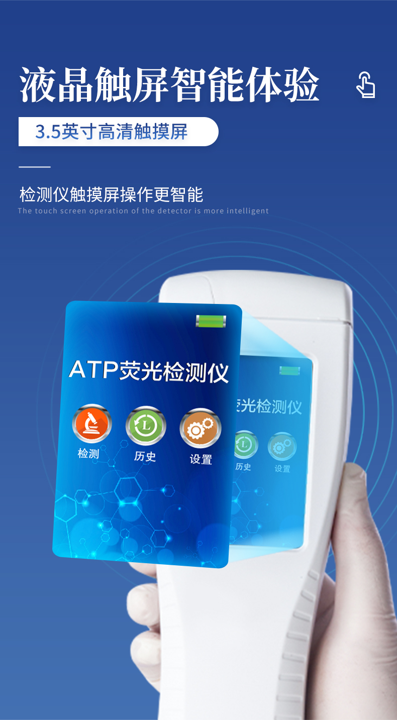 該設(shè)備為全新升級(jí)產(chǎn)品,大屏幕觸摸顯示屏,代替?zhèn)鹘y(tǒng)按鍵。操作采用生物化學(xué)反應(yīng)方法檢測(cè)ATP含量,ATP熒光檢測(cè)儀基于螢火蟲(chóng)發(fā)光原理,利用“熒光素酶—熒光素體系”快速檢測(cè)三磷酸腺苷(ATP)。ATP拭子含有可以裂解細(xì)胞膜的試劑,能將細(xì)胞內(nèi)ATP釋放出來(lái),與試劑中含有的特異性酶發(fā)生反應(yīng),產(chǎn)生光,再用熒光照度計(jì)檢測(cè)發(fā)光值,微生物的數(shù)量與發(fā)光值成正比,由于所有生物活細(xì)胞中含有恒量的ATP,所以ATP含量可以清晰地表明樣品中微生物與其他生物殘余的多少,用于判斷衛(wèi)生狀況。