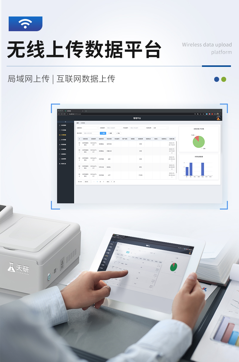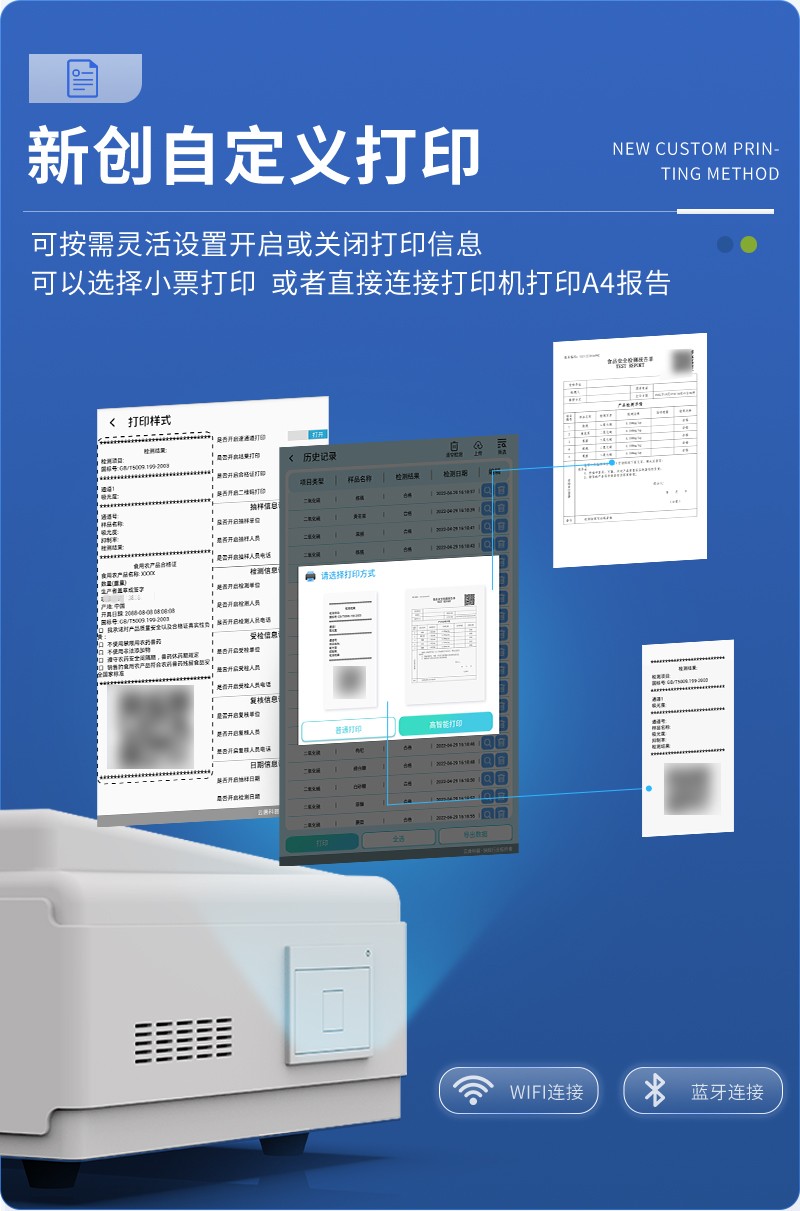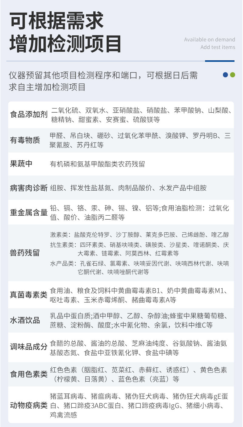 | 儀器采用臺(tái)式一體化系統(tǒng)檢測(cè)技術(shù),將分光光度模塊、數(shù)字化管理模塊、無(wú)線通訊模塊高度集成于一體,可支持檢測(cè)60種食品安全檢測(cè)項(xiàng)目,同時(shí)預(yù)留升級(jí)檢測(cè)方法。 | 儀器檢測(cè)模塊標(biāo)準(zhǔn)化、智能化,檢測(cè)項(xiàng)目可隨意自由組合。檢測(cè)箱體內(nèi)置多個(gè)標(biāo)準(zhǔn)檢測(cè)單元,檢測(cè)模塊可以調(diào)整配置。 | 儀器采用全新安卓智能系統(tǒng),主控芯片采用 ARM Cortex-A7,RK3288/4核處理器,10.1寸高清液晶觸摸豎屏,更加**的UI交互界面,運(yùn)轉(zhuǎn)快捷;儀器配備無(wú)線通信模塊: 4G(APN)通訊模塊、Wifi模塊,藍(lán)牙傳輸,同時(shí)具有雙USB接口以及RJ45接口能以多種方式實(shí)現(xiàn)數(shù)據(jù)保存和數(shù)據(jù)傳輸功能。 | 顯示屏幕:儀器采用10.1英寸豎向液晶觸摸屏顯,搭配運(yùn)行安卓智能操作系統(tǒng),主控芯片采用ARM Cortex-A7,RK3288/4核處理器,主頻1.88Ghz,操作方便,性能更強(qiáng)。 | 檢測(cè)通道:≥12通道;采用精密旋轉(zhuǎn)比色池設(shè)計(jì),使用同芯片同光源校準(zhǔn)精度,解決不同光源之間的誤差值,更加準(zhǔn)確**。(1-12通道間誤差0.1%,**號(hào):ZL202022821055.2) | 儀器光源:高精度進(jìn)口四波長(zhǎng)冷光源,每個(gè)通道均配置 410、520、590、630nm 波長(zhǎng)光源,標(biāo)配**的光路切換裝置,**光路切換功能可實(shí)現(xiàn)64波長(zhǎng),并且所有檢測(cè)項(xiàng)目可實(shí)現(xiàn)所有通道同時(shí)檢測(cè)。 | 設(shè)備可一鍵校準(zhǔn),自動(dòng)保存校準(zhǔn)數(shù)據(jù),自動(dòng)對(duì)比校驗(yàn),得到精準(zhǔn)光源,采用Android SP存儲(chǔ)數(shù)據(jù),光源數(shù)據(jù)永不丟失,方便每一次使用。 | 通訊接口:配備無(wú)線通信模塊、4G(APN)通訊模塊、藍(lán)牙傳輸,同時(shí)具有雙USB接口以及RJ45網(wǎng)線接口,可以多方式實(shí)現(xiàn)數(shù)據(jù)保存及數(shù)據(jù)傳輸。 | 存儲(chǔ)方式:支持U盤存儲(chǔ),標(biāo)準(zhǔn)USB接口,免驅(qū)動(dòng)安裝。檢測(cè)結(jié)果存儲(chǔ)容量20萬(wàn)條以上,可生成Excel表格進(jìn)行拷貝,并具有登錄保護(hù)功能。 | 智能化操作系統(tǒng): | 1、操作系統(tǒng):儀器可在同一檢測(cè)界面自動(dòng)對(duì)應(yīng)相關(guān)檢測(cè)通道,一次性選擇1-12個(gè)樣品名稱,無(wú)需退出界面,節(jié)省操作時(shí)間。并可以對(duì)每個(gè)通道屬性和樣品信息單獨(dú)進(jìn)行編輯,例如送檢單位、人員,檢測(cè)人員等,打印時(shí)勾選打印顯示。 | 2、數(shù)據(jù)集成系統(tǒng):設(shè)備首頁(yè)自動(dòng)匯總分析檢測(cè)數(shù)據(jù),包含:周檢測(cè)數(shù)據(jù)、月檢測(cè)數(shù)據(jù),全部檢測(cè)總數(shù)量,均包含檢測(cè)總數(shù),合格數(shù),不合格數(shù),以及相關(guān)柱形分析圖,各項(xiàng)檢測(cè)數(shù)據(jù)一目了然,無(wú)需電腦查詢,更加快捷直觀。 | 3、數(shù)據(jù)庫(kù)系統(tǒng):十幾項(xiàng)數(shù)據(jù)庫(kù)分類管理儀器:包含項(xiàng)目類型、項(xiàng)目數(shù)據(jù)、檢測(cè)數(shù)據(jù)、歷史記錄、國(guó)標(biāo)信息、曲線信息、采樣信息、檢測(cè)信息、受檢信息、復(fù)核信息、圖表信息、光源校準(zhǔn)信息、打印樣式信息、樣品庫(kù)信息等等,數(shù)據(jù)庫(kù)之間互相協(xié)調(diào)聯(lián)動(dòng)保證數(shù)據(jù)的真實(shí)完整性。同時(shí)產(chǎn)品數(shù)據(jù)庫(kù)以及歷史檢測(cè)記錄支持一鍵檢索功能。 | 4、限量規(guī)判系統(tǒng):具有限量查詢、添加物質(zhì)合規(guī)判定系統(tǒng)。檢測(cè)出結(jié)果后,系統(tǒng)自動(dòng)調(diào)用系統(tǒng)數(shù)據(jù)庫(kù)中相關(guān)國(guó)標(biāo)進(jìn)行比對(duì)判定,客觀顯示判定結(jié)果是否合格。 | 5、項(xiàng)目預(yù)設(shè)系統(tǒng):儀器具有任務(wù)預(yù)設(shè)模塊,一鍵提前預(yù)設(shè),給出方便快捷的新檢測(cè)方案,每一個(gè)任務(wù)分別可以設(shè)置不同的樣品、批次、編號(hào)、來源、備注、抽樣信息、檢測(cè)信息、受檢信息、復(fù)核信息等更多信息。樣品送檢時(shí)一鍵調(diào)取保存信息,并可多次調(diào)取,大大提高檢測(cè)效率。 | 6、數(shù)據(jù)監(jiān)管系統(tǒng):同步對(duì)接監(jiān)管平臺(tái),數(shù)據(jù)可局域網(wǎng)和互聯(lián)網(wǎng)數(shù)據(jù)上傳,檢測(cè)結(jié)果可選擇直接傳至食品安全監(jiān)管平臺(tái)。進(jìn)行區(qū)域食品安全監(jiān)管及大數(shù)據(jù)分析處理與數(shù)據(jù)統(tǒng)計(jì),檢測(cè)區(qū)域食品安全長(zhǎng)短期動(dòng)態(tài),達(dá)到食品安全問題預(yù)估、預(yù)警。 | 7、全新打印系統(tǒng):內(nèi)置全新打印機(jī),新創(chuàng)自定義打印方式,可按需靈活勾選控制:二維碼,抽樣信息、檢測(cè)信息,受檢信息、復(fù)核信息、抽樣日期、檢測(cè)日期等信息的打印。 | 8、A4紙版本報(bào)告打印功能(可選配):設(shè)備擁有兩種結(jié)果展示方式,可以自動(dòng)生成A4打印模板和小票打印模板兩種樣式,可通過WiFi及網(wǎng)線等方式鏈接外置打印機(jī)可進(jìn)行打印。 | 供電模式:儀器交直流兩用,直流12V供電,可連接車載電源,可配6ah大容量充電鋰電池,電量可實(shí)時(shí)顯示,方便戶外流動(dòng)測(cè)試。 