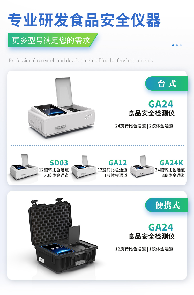 | 食品添加劑:二氧化硫、雙氧水、亞硝酸鹽、硝酸鹽、苯甲酸鈉、山梨酸鉀、糖精鈉、甜蜜素、木耳硫酸鎂等 | 有毒有害物質(zhì):甲醛、吊白塊、硼砂、過氧化苯甲酰、溴酸鉀、羅丹明B、三聚氰胺、蘇丹紅、工業(yè)堿、尿素、明礬等 | 果蔬:農(nóng)藥殘留(酶抑制率法) | 病害肉:組胺、揮發(fā)性鹽基氮 | 重金屬含量:鉛、鎘、鉻、汞、砷、錫、鎳、鋁等 | 水酒飲品分析:酒中甲醇、乙醇、乳品及牛奶中蛋白質(zhì) | 調(diào)味品成分: 食醋的總酸、醬油的總酸、芝麻油純度、谷氨酸鈉、醬油氨基酸態(tài)氮、食鹽中亞鐵氰化鉀、食鹽中碘等 | 食用色素類:紅色色素(胭脂紅、莧菜紅、莧菜紅)、黃色色素(檸檬黃、日落黃)、藍(lán)色色素(亮藍(lán))等 | 蜂蜜成分:果糖和葡萄糖、蔗糖、淀粉酶、酸度等 | 食用油脂:過氧化值、酸價(jià)等 |
