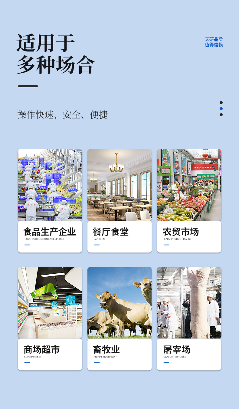 產(chǎn)品用途: 該膠體金檢測儀適用于豬、雞、鴨、羊、牛、牛奶等畜禽肉產(chǎn)品中獸藥殘留,包括抗生素類殘留、瘦肉精激素類殘留和水產(chǎn)品有毒有害物質(zhì)的現(xiàn)場快速篩查定及性定量檢測。 該多功能獸藥殘留檢測儀為集成化肉品安全快速檢測分析設(shè)備,可廣泛應(yīng)用于畜牧養(yǎng)殖場、屠宰場、食品肉產(chǎn)品深加工企業(yè)、食藥監(jiān)局