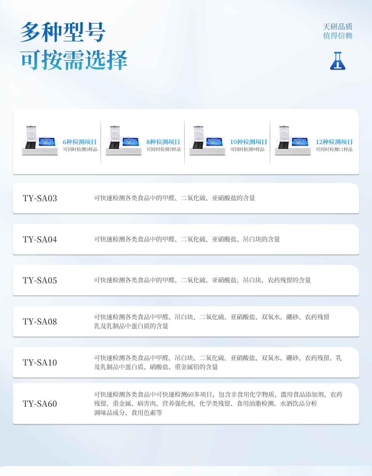 多功能食品安全檢測儀可快速檢測200多項(xiàng)目,包含非食用化學(xué)物質(zhì)、濫用食品添加劑、農(nóng)藥殘留、獸藥殘留、重金屬、病害肉、營養(yǎng)強(qiáng)化劑、抗生素類殘留、激素類殘留、真菌毒素類殘留、化學(xué)類殘留等現(xiàn)場的定性定量檢測。該多功能食品安全檢測儀為集成化食品安全快速檢測分析設(shè)備,廣泛應(yīng)用于市場監(jiān)管局、檢測中心、衛(wèi)生監(jiān)督部門、農(nóng)業(yè)部門、院校及各單位食堂、食品肉產(chǎn)品深加工企業(yè)、商超市場、司法部門、餐飲機(jī)構(gòu)、養(yǎng)殖場、屠宰場、檢驗(yàn)檢疫部門等單位使用。