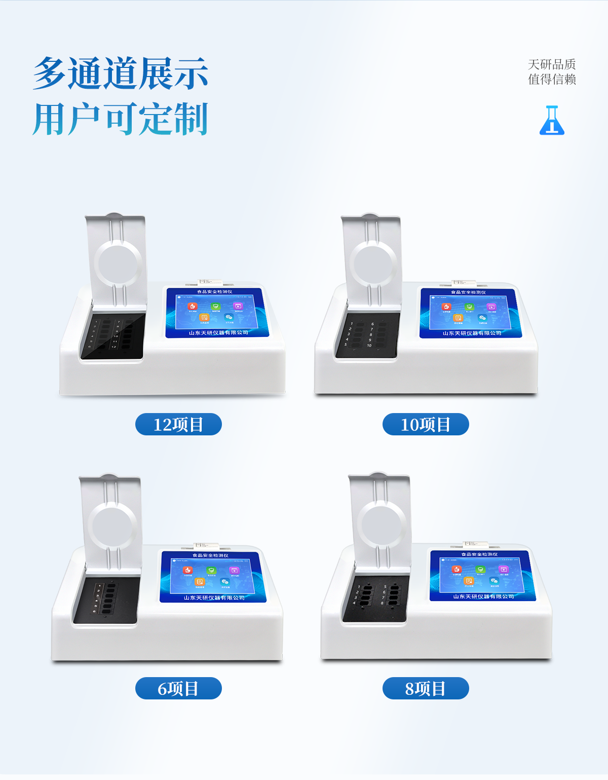 | 安卓智能操作系統(tǒng),采用更加**和人性化操作,儀器具有網(wǎng)線連接、wifi聯(lián)網(wǎng)上傳、GPRS無線遠(yuǎn)傳功能,快速上傳數(shù)據(jù)。 | 智能化程度高,儀器具有自檢功能:具有開機(jī)自檢和調(diào)零功能,具有自動(dòng)檢測重復(fù)性功能。 | 檢測通道:≥12個(gè)檢測通道,可以同時(shí)測試多個(gè)樣品,每個(gè)樣品由程序控制分別獨(dú)立工作,不會(huì)互相干擾。 | 顯示方式:≥8英寸液晶觸摸屏顯示,人性化中文操作界面,讀數(shù)直觀、簡單。 | 配備新一代嵌入式熱敏打印機(jī),可選擇手動(dòng)打印或者自動(dòng)打印,檢測完成可自動(dòng)打印檢測報(bào)告和二維碼。 | 光源采用進(jìn)口超高亮發(fā)光二極管,高精度、穩(wěn)定性強(qiáng)、光源可控、可以關(guān)掉不使用的光源,功耗更低。 | 采用USB2.0接口設(shè)計(jì),方便數(shù)據(jù)的存貯和移動(dòng),并可隨時(shí)與計(jì)算機(jī)直接相連,并且可用計(jì)算機(jī)控制儀器。實(shí)現(xiàn)數(shù)據(jù)查詢、瀏覽、分析、統(tǒng)計(jì)、打印等。 | 儀器帶有監(jiān)管平臺。數(shù)據(jù)可局域網(wǎng)和互聯(lián)網(wǎng)數(shù)據(jù)上傳,檢測結(jié)果直接傳至食品安全監(jiān)管平臺。進(jìn)行區(qū)域食品安全監(jiān)管及大數(shù)據(jù)分析處理,檢測區(qū)域食品安全長短期動(dòng)態(tài),達(dá)到食品安全問題預(yù)估、預(yù)警 | 一體化便攜式快檢設(shè)備,滿足現(xiàn)場及流動(dòng)檢測使用需求,能夠在同一軟件下實(shí)現(xiàn)所有檢測項(xiàng)目的檢測,并可通過同一窗口直觀顯示檢測結(jié)果。 | 儀器具有多品類多種類樣品菜單庫,可靈活選擇檢測樣品,不同的檢測通道可同時(shí)檢測不同的樣品項(xiàng)目。也可在儀器上直接編輯錄入樣品名稱、檢測指標(biāo)、送檢單位等信息并保存進(jìn)樣品數(shù)據(jù)庫。 | 樣品處理簡單省力,整體操作快速、安全、便捷。 | 儀器具有自身保護(hù)功能,可設(shè)置用戶名及密碼,防止非工作人員操作等。 | 高靈敏度,高檢測精度,高重復(fù)性精度,掃描式高精度光學(xué)傳感器。 | 儀器具有重新校準(zhǔn)、鎖定、恢復(fù)出廠設(shè)置功能。 | 支持U盤存儲(chǔ)。 結(jié)果判定線可修改,對照值標(biāo)定值可保存,斷電不丟失數(shù)據(jù)。 |