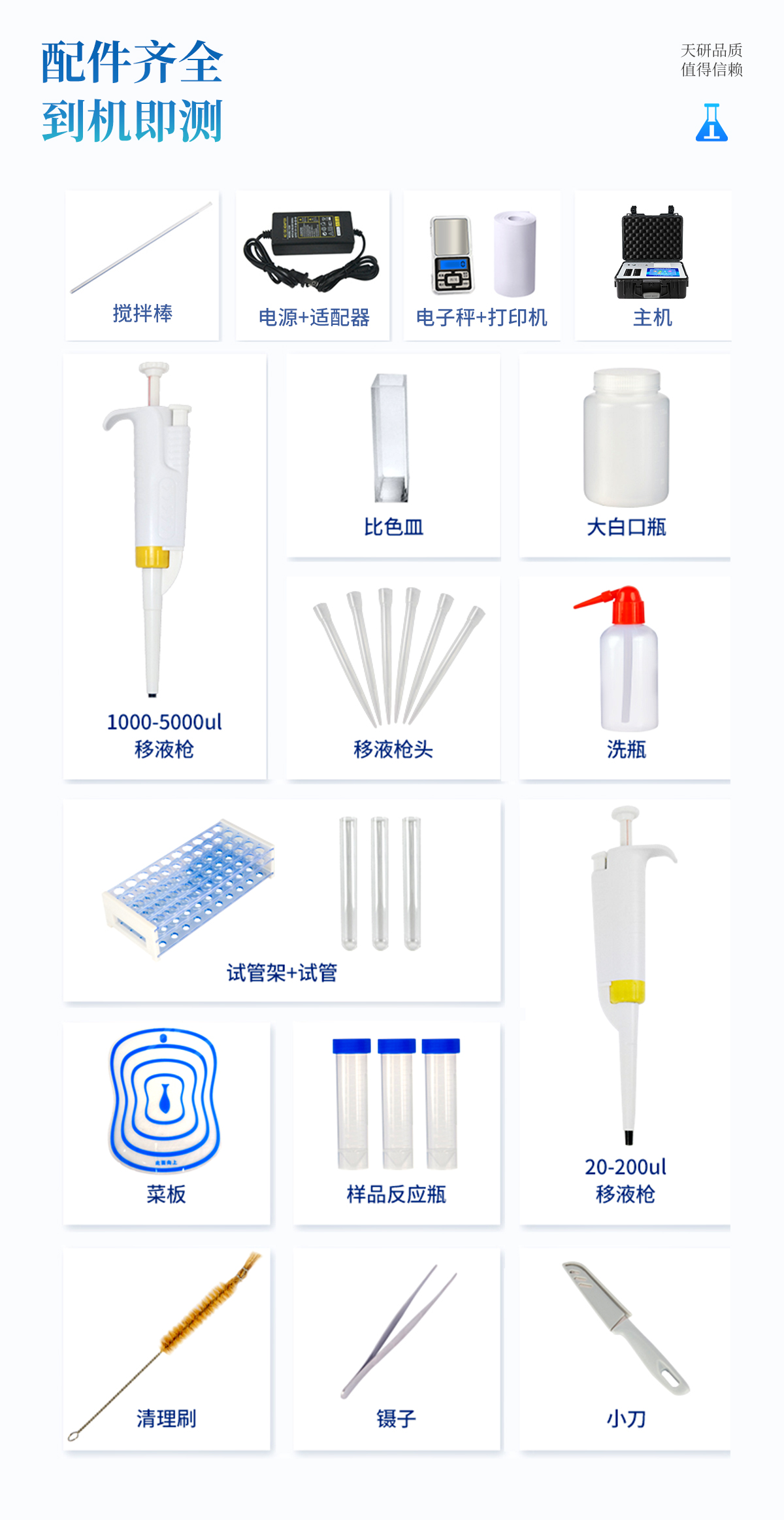 | 食品添加劑:二氧化硫、雙氧水、亞硝酸鹽、硝酸鹽、苯甲酸鈉、山梨酸、糖精鈉、甜蜜素、安賽蜜、硫酸鎂等 | 有毒有害物質:甲醛、吊白塊、硼砂、過氧化苯甲酰、溴酸鉀、羅丹明B、三聚氰胺、蘇丹紅等 | 果蔬中:有機磷和氨基甲酸酯類農藥殘留; | 病害肉診斷:組胺、揮發(fā)性鹽基氮、肉制品酸價、水發(fā)產品中組胺 | 重金屬含量:鉛、鎘、鉻、汞、砷、錫、鎳、鋁等;食用油脂檢測:過氧化值、酸價、油脂丙二醛等。 | 瘦肉精激素類(獸藥):鹽酸克倫特羅、沙丁胺醇、萊克多巴胺、己烯雌酚、喹乙醇等 | 抗生素殘留類(獸藥):四環(huán)素類、硝基呋喃類、磺胺類、沙星類、喹諾酮類、慶大霉素、鏈霉素、阿莫西林、紅霉素等 | 水產品安全類:孔雀石綠、氯霉素、呋喃妥因代謝、呋喃西林代謝、呋喃它酮代謝、呋喃唑酮代謝等 | 真菌毒素類:食用油、糧食及飼料中黃曲霉毒素B1、奶中黃曲霉毒素M1、嘔吐毒素、玉米赤霉烯酮、赭曲霉毒素A等 | 水酒飲品分析:乳品及牛奶中蛋白質;酒中甲醇、乙醇、雜醇油;蜂蜜中果糖和葡萄糖、蔗糖、淀粉酶、酸度;水中氰化物、余氯,飲料中維C等 | 調味品成分:食醋的總酸、醬油的總酸、芝麻油純度、谷氨酸鈉、醬油氨基酸態(tài)氮、食鹽中亞鐵氰化鉀、食鹽中碘等 | 食用色素類:紅色色素(胭脂紅、莧菜紅、赤蘚紅、誘惑紅)、黃色色素(檸檬黃、日落黃)、藍色色素(亮藍)等 | 動物疫病類:豬藍耳病毒、豬瘟病毒、豬偽狂犬病毒、豬偽狂犬病毒gE蛋白、豬口蹄疫3ABC蛋白、豬口蹄疫病毒IgG、豬細小病毒、雞禽流感等 |