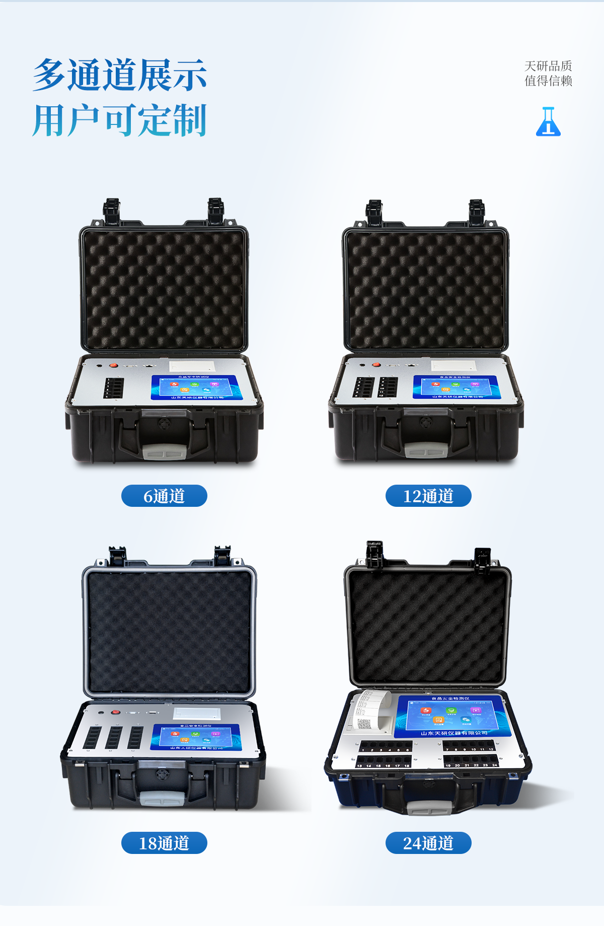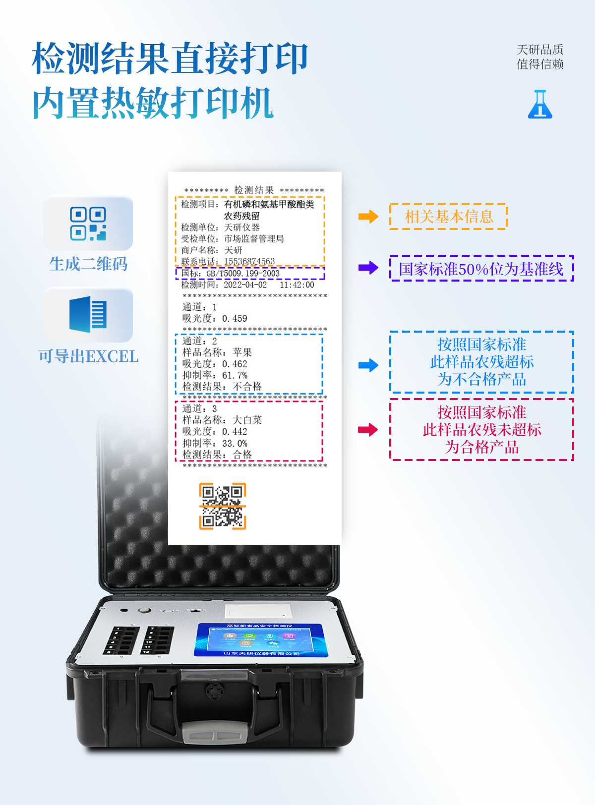 | 安卓智能操作系統(tǒng),采用更加**的UI交互界面,儀器具有wifi聯(lián)網上傳、4G聯(lián)網傳輸、GPRS無線遠傳、網線連接功能,快速批量上傳數據。 | 智能化程度高,儀器具有自檢功能:具有開機自檢和調零功能,具有自動檢測重復性功能。 | 新一代高速熱敏打印機,檢測完成可自動打印或批量打印檢測報告和二維碼。 | 儀器帶有監(jiān)管平臺,數據可局域網和互聯(lián)網數據上傳,檢測結果直接傳至食品安全監(jiān)管平臺。進行區(qū)域食品安全監(jiān)管及大數據分析處理與數據統(tǒng)計,檢測區(qū)域食品安全長短期動態(tài),達到食品安全問題預估、預警 | 一體化主機,包含食品安全檢測模塊、多通道農藥殘留檢測模塊、膠體金免疫層析檢測模塊。 | 一體化便攜式快檢設備,滿足現場及流動檢測使用需求,能夠在同一軟件下實現所有檢測項目的檢測,并可通過同一窗口直觀顯示檢測結果。 | 膠體金模塊檢測方式:軌道式自動傳輸掃描,檢測完成后自動退出檢測卡。 | CT線自動識別,無需手動調整。 | 內置強大的數據庫,具有多品類多種類樣品菜單功能,可靈活選擇檢測樣品,不同的檢測通道可同時檢測不同的樣品項目。也可在儀器上直接編輯錄入樣品名稱、檢測指標、送檢單位等信息并保存進樣品數據庫。 | 產品內置操作演示視頻,是您身邊的化驗指導專家。 | 樣品處理簡單省力,整體操作快速、安全、便捷。 | 儀器具有自身保護功能,可設置用戶名及密碼,防止非工作人員操作等。 | 高靈敏度,高檢測精度,高重復性精度,掃描式高精度光學傳感器。 | 結果判定線可修改,對照值標定值可保存,斷電不丟失數據。 | 兼容市場上所有的膠體金卡,使用耗材不受限制,極大增強用戶使用體驗。 | 儀器具有重新校準、鎖定、恢復出廠設置功能。 |