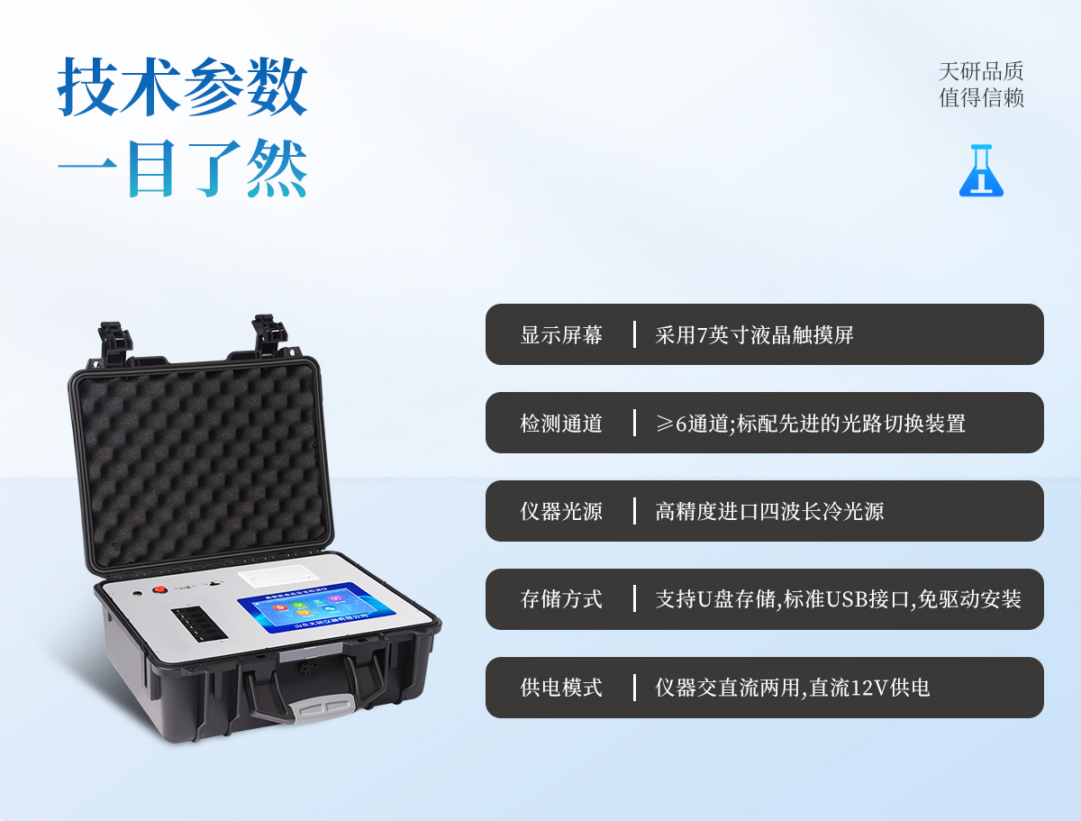 | 主控芯片采用ARM Cortex-A7,RK3288/4核處理器,主頻1.88Ghz,運轉速度更快速,穩(wěn)定性更強。 | 顯示方式:7英寸液晶觸摸屏顯示,人性化中文操作界面,讀數直觀、簡單。 | 交直流兩用,直流12V供電,可連接車載電源,可配6ah大容量充電鋰電池,方便戶外流動測試。 | 四波長冷光源,6個檢測通道,每個通道均配置410、520、590、630nm波長光源,標配**的光路切換裝置,專業(yè)光路切換功能可實現*多64波長,并且所有檢測項目可實現所有通道同時檢測。 | 智能恒流穩(wěn)壓,光強自動調節(jié)與校準,長時間連續(xù)工作光源無溫漂現象。 | 內置新國家限量標準,與所測結果進行現場比對,并持續(xù)更新標準。 | 不間斷進樣,連續(xù)檢測 | 樣本編號自動累加。 | 數據無線上傳平臺,并可從平臺導出為Excel表格。 | 檢測結果存儲容量20萬條 | 同時支持U盤拷貝,標準USB接口,免驅動插拔。 | 檢測項目可擴充,固件可升級 | 儀器尺寸:43×35×19cm, 主機凈重:5.1kg |