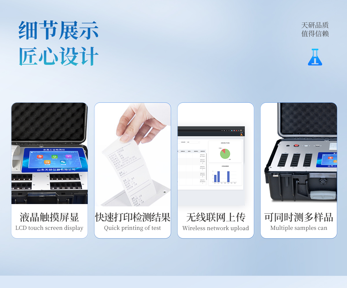 | 安卓智能操作系統(tǒng),采用更加**的UI交互界面,儀器具有wifi聯(lián)網(wǎng)上傳、4G聯(lián)網(wǎng)傳輸、GPRS無線遠(yuǎn)傳、網(wǎng)線連接功能,快速批量上傳數(shù)據(jù)。 | 智能化程度高,儀器具有自檢功能:具有開機(jī)自檢和調(diào)零功能,具有自動(dòng)檢測重復(fù)性功能。 | 新一代高速熱敏打印機(jī),檢測完成可自動(dòng)打印或批量打印檢測報(bào)告和二維碼。 | 儀器帶有監(jiān)管平臺(tái),數(shù)據(jù)可局域網(wǎng)和互聯(lián)網(wǎng)數(shù)據(jù)上傳,檢測結(jié)果直接傳至食品安全監(jiān)管平臺(tái)。進(jìn)行區(qū)域食品安全監(jiān)管及大數(shù)據(jù)分析處理與數(shù)據(jù)統(tǒng)計(jì),檢測區(qū)域食品安全長短期動(dòng)態(tài),達(dá)到食品安全問題預(yù)估、預(yù)警 | 一體化主機(jī),包含食品安全檢測模塊、多通道農(nóng)藥殘留檢測模塊、膠體金免疫層析檢測模塊。 | 一體化便攜式快檢設(shè)備,滿足現(xiàn)場及流動(dòng)檢測使用需求,能夠在同一軟件下實(shí)現(xiàn)所有檢測項(xiàng)目的檢測,并可通過同一窗口直觀顯示檢測結(jié)果。 | 膠體金模塊檢測方式:軌道式自動(dòng)傳輸掃描,檢測完成后自動(dòng)退出檢測卡。 | CT線自動(dòng)識(shí)別,無需手動(dòng)調(diào)整。 | 內(nèi)置強(qiáng)大的數(shù)據(jù)庫,具有多品類多種類樣品菜單功能,可靈活選擇檢測樣品,不同的檢測通道可同時(shí)檢測不同的樣品項(xiàng)目。也可在儀器上直接編輯錄入樣品名稱、檢測指標(biāo)、送檢單位等信息并保存進(jìn)樣品數(shù)據(jù)庫。 | 產(chǎn)品內(nèi)置操作演示視頻,是您身邊的化驗(yàn)指導(dǎo)專家。 | 樣品處理簡單省力,整體操作快速、安全、便捷。 | 儀器具有自身保護(hù)功能,可設(shè)置用戶名及密碼,防止非工作人員操作等。 | 高靈敏度,高檢測精度,高重復(fù)性精度,掃描式高精度光學(xué)傳感器。 | 結(jié)果判定線可修改,對照值標(biāo)定值可保存,斷電不丟失數(shù)據(jù)。 | 兼容市場上所有的膠體金卡,使用耗材不受限制,極大增強(qiáng)用戶使用體驗(yàn)。 | 儀器具有重新校準(zhǔn)、鎖定、恢復(fù)出廠設(shè)置功能。 |