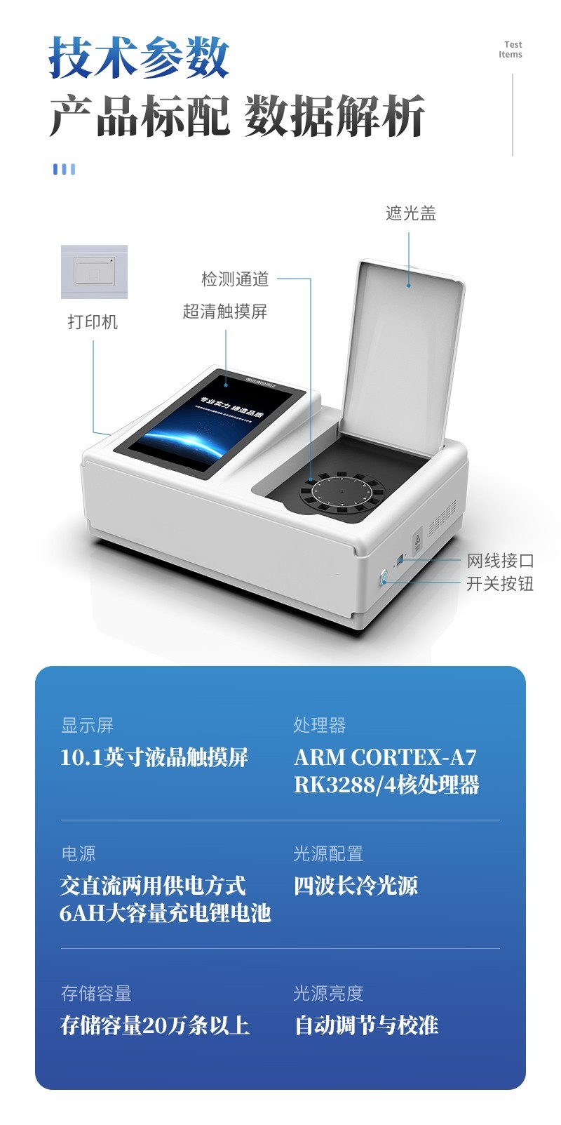 | 儀器采用臺(tái)式一體化系統(tǒng)檢測技術(shù),將分光光度模塊、新型農(nóng)殘檢測模塊、數(shù)字化管理模塊、無線通訊模塊高度集成于一體,支持檢測200種食品安全檢測項(xiàng)目,同時(shí)預(yù)留升級(jí)檢測方法。 | 儀器檢測模塊標(biāo)準(zhǔn)化、智能化,可隨意自由組合。檢測箱體內(nèi)置多個(gè)標(biāo)準(zhǔn)檢測單元,檢測模塊可以調(diào)整配置。 | 儀器采用全新安卓智能系統(tǒng),主控芯片采用 ARM Cortex-A7,RK3288/4核處理器,10.1寸高清液晶觸摸豎屏,更加**的UI交互界面,運(yùn)轉(zhuǎn)快捷;儀器配備無線通信模塊: 4G(APN)通訊模塊、Wifi模塊,藍(lán)牙傳輸,同時(shí)具有雙USB接口以及RJ45接口能以多種方式實(shí)現(xiàn)數(shù)據(jù)保存和數(shù)據(jù)傳輸功能。 | 創(chuàng)新檢測模式: | ★檢測通道:≥12通道;采用精密旋轉(zhuǎn)比色池設(shè)計(jì),使用同芯片同光源校準(zhǔn)精度,解決不同光源之間的誤差值。1-12通道間誤差0.1%。(**號(hào):ZL202022821055.2) | ★儀器具有自動(dòng)識(shí)別比色皿檢測功能,即:將樣品比色皿放入儀器后,點(diǎn)擊樣品檢測,儀器自動(dòng)識(shí)別比色皿進(jìn)行通道檢測。 | 進(jìn)口高精光源: | 高精度進(jìn)口四波長冷光源,通道配置 410、520、590、630nm 波長光源,一個(gè)光源芯片驅(qū)動(dòng)一個(gè)光源,誤差極小,每臺(tái)設(shè)備單獨(dú)**校準(zhǔn)光源,**比對(duì),同時(shí)參照四種不同波段光源全方位覆蓋市面上99%的農(nóng)殘食品項(xiàng)目檢測。 | 智能化操作系統(tǒng): | 便捷操作系統(tǒng):設(shè)備檢測時(shí)可在同一檢測界面自動(dòng)對(duì)應(yīng)相關(guān)檢測通道一次性選擇1-12個(gè)樣品名稱,無須退出界面,節(jié)省操作時(shí)間。 | 數(shù)據(jù)集成系統(tǒng):設(shè)備首頁自動(dòng)統(tǒng)計(jì)檢測數(shù)據(jù)包含:周檢測數(shù)據(jù)、月檢測數(shù)據(jù),全部檢測總數(shù)量,均包含檢測總數(shù),合格數(shù),不合格數(shù),以及相關(guān)柱形分析圖,對(duì)各項(xiàng)檢測數(shù)據(jù)清晰掌握,無需電腦查詢,更加快捷直觀。 | 項(xiàng)目預(yù)設(shè)系統(tǒng):支持添加單個(gè)及多個(gè)相同或不相同的任務(wù)預(yù)設(shè),一鍵快速調(diào)取,每一個(gè)任務(wù)分別可以設(shè)置不同的樣品、批次、編號(hào)、來源、備注、抽樣信息、檢測信息、受檢信息、復(fù)核信息等更多信息。無縫鏈接平臺(tái)和APP實(shí)時(shí)查看下發(fā)任務(wù)。 | 數(shù)據(jù)監(jiān)管系統(tǒng):同步對(duì)接監(jiān)管平臺(tái),數(shù)據(jù)可局域網(wǎng)和互聯(lián)網(wǎng)數(shù)據(jù)上傳,檢測結(jié)果可選擇直接傳至食品安全監(jiān)管平臺(tái)。集成OSS輸出存儲(chǔ)服務(wù)、區(qū)分設(shè)備定向管理應(yīng)用,進(jìn)行區(qū)域食品安全監(jiān)管及大數(shù)據(jù)分析處理與數(shù)據(jù)統(tǒng)計(jì),檢測區(qū)域食品安全長短期動(dòng)態(tài),達(dá)到食品安全問題預(yù)估、預(yù)警。 | 自定義打印系統(tǒng):內(nèi)置全新打印系統(tǒng),新創(chuàng)自定義打印方式,可按需靈活設(shè)置開啟或關(guān)閉:產(chǎn)品合格證(國家農(nóng)業(yè)部標(biāo)準(zhǔn)要求),二維碼,抽樣信息、檢測信息,受檢信息、復(fù)核信息、抽樣日期、檢測日期等信息的打印。 | 系統(tǒng)遠(yuǎn)程更新功能:可定向分客戶分儀器更新系統(tǒng),按照不同客戶后期實(shí)際需求添加項(xiàng)目,無需機(jī)器返廠,即可遠(yuǎn)程實(shí)時(shí)升級(jí)全新系統(tǒng),節(jié)省時(shí)間成本及避免運(yùn)輸造成設(shè)備損壞。 | 儀器主機(jī)采用一體化防水、抗壓、防撞擊、防腐蝕箱體設(shè)計(jì),同時(shí)配備交直流供電,可連接車載電源,可選配大容量充電鋰電池,滿足現(xiàn)場野外檢測需求。 | 安全證書,放心保障:儀器具有中國計(jì)量科學(xué)研究院校準(zhǔn)證書,**認(rèn)證。 |