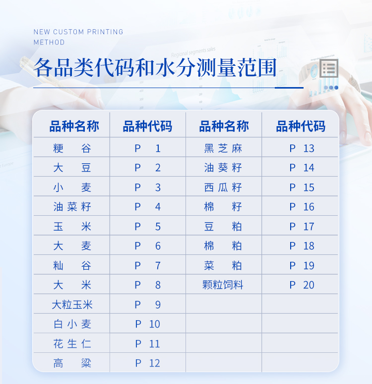 | 測(cè)量范圍:可測(cè)量谷類、玉米、東北玉米、大麥、小麥、白小麥、大米、豆粕、花生仁、菜粕、高粱、黑芝麻、棉籽、棉粕、秈谷、大豆、油菜籽、飼料、蔬菜種子等非金屬顆粒狀物質(zhì)。 | 快速準(zhǔn)確:數(shù)秒內(nèi)即可顯示結(jié)果,測(cè)量誤差≤±0.5℅ | 操作簡(jiǎn)單:20個(gè)常見(jiàn)品種已預(yù)先定標(biāo),不需秤樣、用料簡(jiǎn)取樣后可立即測(cè)量水分 | 水分測(cè)量范圍:3-35℅ | 使用環(huán)境溫度:0~40℃ | 溫度補(bǔ)償:自動(dòng) | 定 標(biāo):浮動(dòng)四點(diǎn)定標(biāo),品種不限(常見(jiàn)品種20個(gè)已預(yù)先定標(biāo),可直接測(cè)量) | 工作電源:直流6V(5號(hào)干電池四節(jié)) | 自動(dòng)關(guān)機(jī):超過(guò)三分鐘無(wú)操作自動(dòng)關(guān)機(jī)。 | 便攜方便:重約1千克、外型小巧、電源交直流二用,適合各種工作場(chǎng)合 | 適合國(guó)情:用戶可對(duì)本地特殊品種采用本機(jī)獨(dú)創(chuàng)的四點(diǎn)定標(biāo)法自行定標(biāo),自行修正水分值 | 高性價(jià)比:技術(shù)含量高,性能**而價(jià)格相比同類產(chǎn)品較低。 |