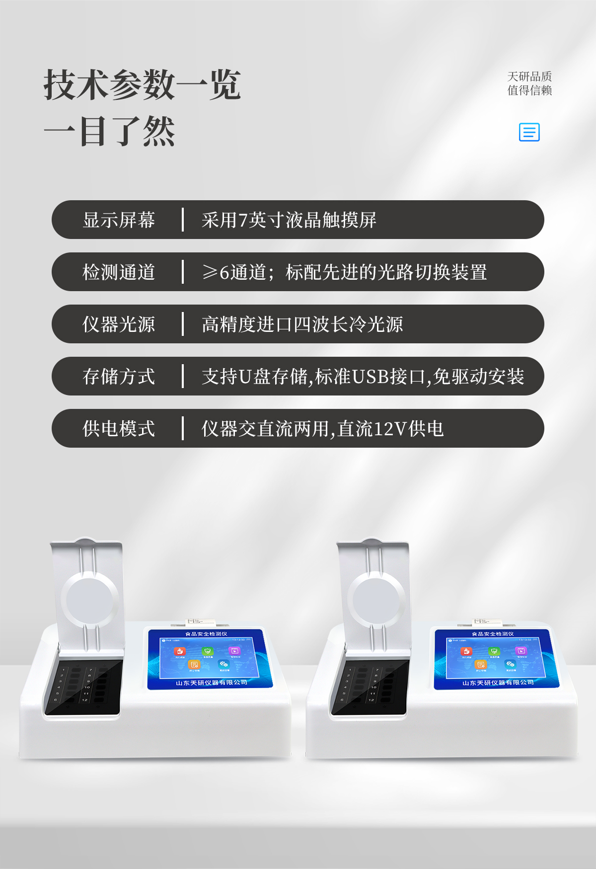 | 儀器采用臺式一體化系統(tǒng)檢測技術(shù),將分光光度模塊、新型農(nóng)殘檢測模塊、數(shù)字化管理模塊、無線通訊模塊高度集成于一體,支持檢測200種食品安全檢測項(xiàng)目,同時(shí)預(yù)留升級檢測方法。 | 儀器檢測模塊標(biāo)準(zhǔn)化、智能化,可隨意自由組合。檢測箱體內(nèi)置多個(gè)標(biāo)準(zhǔn)檢測單元,檢測模塊可以調(diào)整配置。 | 儀器采用全新安卓智能系統(tǒng),主控芯片采用 ARM Cortex-A7,RK3288/4核處理器,10.1寸高清液晶觸摸豎屏,更加**的UI交互界面,運(yùn)轉(zhuǎn)快捷;儀器配備無線通信模塊: 4G(APN)通訊模塊、Wifi模塊,藍(lán)牙傳輸,同時(shí)具有雙USB接口以及RJ45接口能以多種方式實(shí)現(xiàn)數(shù)據(jù)保存和數(shù)據(jù)傳輸功能。 | 創(chuàng)新檢測模式: | ★檢測通道:≥12通道;采用精密旋轉(zhuǎn)比色池設(shè)計(jì),使用同芯片同光源校準(zhǔn)精度,解決不同光源之間的誤差值。1-12通道間誤差0.1%。(**號:ZL202022821055.2) | ★儀器具有自動識別比色皿檢測功能,即:將樣品比色皿放入儀器后,點(diǎn)擊樣品檢測,儀器自動識別比色皿進(jìn)行通道檢測。 | 進(jìn)口高精光源: | 高精度進(jìn)口四波長冷光源,通道配置 410、520、590、630nm 波長光源,一個(gè)光源芯片驅(qū)動一個(gè)光源,誤差極小,每臺設(shè)備單獨(dú)**校準(zhǔn)光源,**比對,同時(shí)參照四種不同波段光源全方位覆蓋市面上99%的農(nóng)殘食品項(xiàng)目檢測。 | 智能化操作系統(tǒng): | 便捷操作系統(tǒng):設(shè)備檢測時(shí)可在同一檢測界面自動對應(yīng)相關(guān)檢測通道一次性選擇1-12個(gè)樣品名稱,無須退出界面,節(jié)省操作時(shí)間。 | 數(shù)據(jù)集成系統(tǒng):設(shè)備首頁自動統(tǒng)計(jì)檢測數(shù)據(jù)包含:周檢測數(shù)據(jù)、月檢測數(shù)據(jù),全部檢測總數(shù)量,均包含檢測總數(shù),合格數(shù),不合格數(shù),以及相關(guān)柱形分析圖,對各項(xiàng)檢測數(shù)據(jù)清晰掌握,無需電腦查詢,更加快捷直觀。 | 項(xiàng)目預(yù)設(shè)系統(tǒng):支持添加單個(gè)及多個(gè)相同或不相同的任務(wù)預(yù)設(shè),一鍵快速調(diào)取,每一個(gè)任務(wù)分別可以設(shè)置不同的樣品、批次、編號、來源、備注、抽樣信息、檢測信息、受檢信息、復(fù)核信息等更多信息。無縫鏈接平臺和APP實(shí)時(shí)查看下發(fā)任務(wù)。 | 數(shù)據(jù)監(jiān)管系統(tǒng):同步對接監(jiān)管平臺,數(shù)據(jù)可局域網(wǎng)和互聯(lián)網(wǎng)數(shù)據(jù)上傳,檢測結(jié)果可選擇直接傳至食品安全監(jiān)管平臺。集成OSS輸出存儲服務(wù)、區(qū)分設(shè)備定向管理應(yīng)用,進(jìn)行區(qū)域食品安全監(jiān)管及大數(shù)據(jù)分析處理與數(shù)據(jù)統(tǒng)計(jì),檢測區(qū)域食品安全長短期動態(tài),達(dá)到食品安全問題預(yù)估、預(yù)警。 | 自定義打印系統(tǒng):內(nèi)置全新打印系統(tǒng),新創(chuàng)自定義打印方式,可按需靈活設(shè)置開啟或關(guān)閉:產(chǎn)品合格證(國家農(nóng)業(yè)部標(biāo)準(zhǔn)要求),二維碼,抽樣信息、檢測信息,受檢信息、復(fù)核信息、抽樣日期、檢測日期等信息的打印。 | 系統(tǒng)遠(yuǎn)程更新功能:可定向分客戶分儀器更新系統(tǒng),按照不同客戶后期實(shí)際需求添加項(xiàng)目,無需機(jī)器返廠,即可遠(yuǎn)程實(shí)時(shí)升級全新系統(tǒng),節(jié)省時(shí)間成本及避免運(yùn)輸造成設(shè)備損壞。 | 儀器主機(jī)采用一體化防水、抗壓、防撞擊、防腐蝕箱體設(shè)計(jì),同時(shí)配備交直流供電,可連接車載電源,可選配大容量充電鋰電池,滿足現(xiàn)場野外檢測需求。 | 安全證書,放心保障:儀器具有中國計(jì)量科學(xué)研究院校準(zhǔn)證書,**認(rèn)證。 |