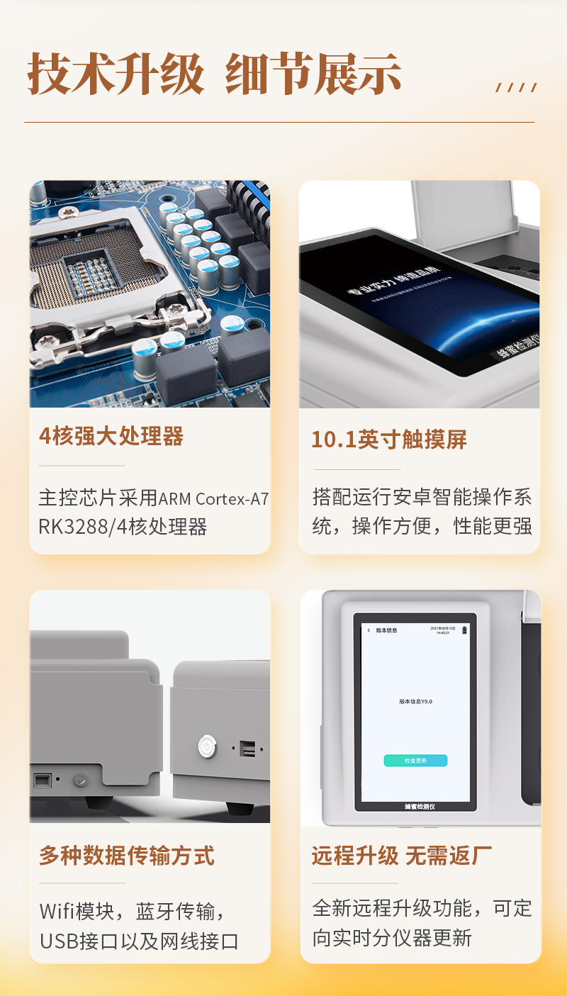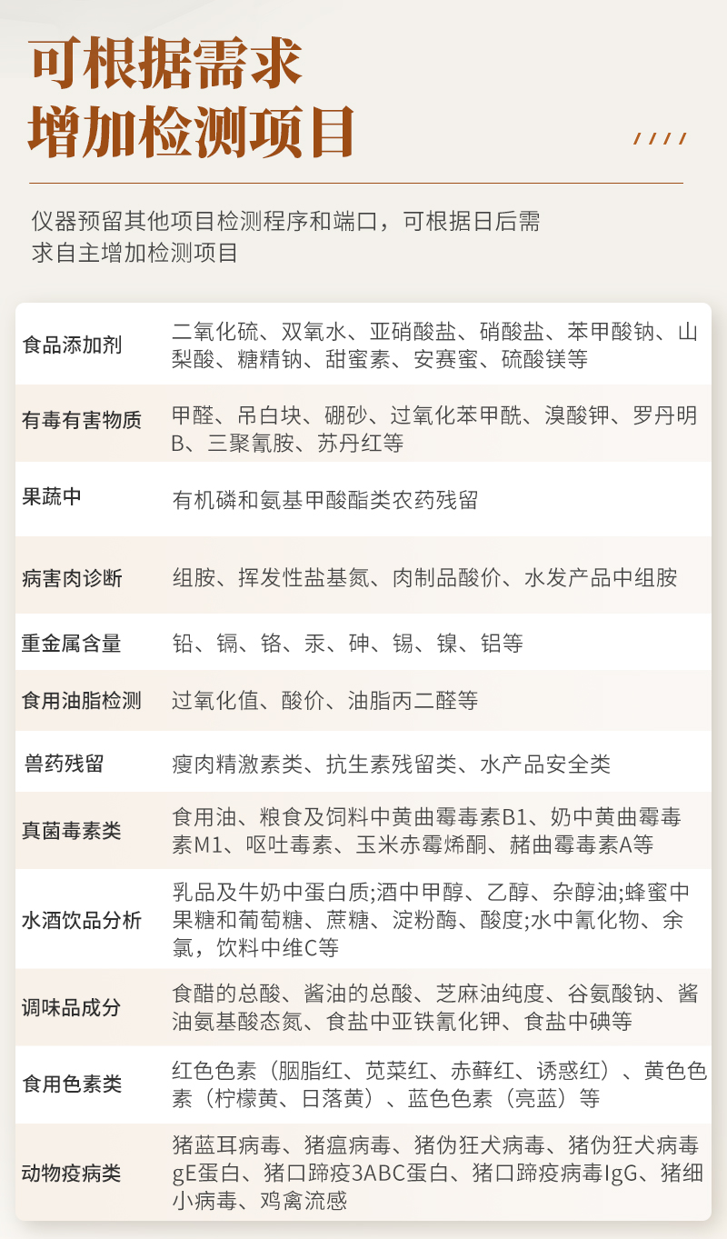 | 儀器采用手提式一體化系統(tǒng)檢測技術(shù),將分光光度模塊、膠體金檢測模塊、新型農(nóng)殘檢測模塊、數(shù)字化管理模塊、無線通訊模塊高度集成于一體,支持檢測200種食品安全檢測項目,同時預(yù)留升級檢測方法。 | 儀器檢測模塊標(biāo)準(zhǔn)化、智能化,可隨意自由組合。檢測箱體內(nèi)置多個標(biāo)準(zhǔn)檢測單元,檢測模塊可以調(diào)整配置。 | 儀器采用全新安卓智能系統(tǒng),主控芯片采用 ARM Cortex-A7,RK3288/4核處理器,10.1寸高清液晶觸摸豎屏,更加**的UI交互界面,運轉(zhuǎn)快捷;儀器配備無線通信模塊: 4G(APN)通訊模塊、Wifi模塊,藍(lán)牙傳輸,同時具有雙USB接口以及RJ45接口能以多種方式實現(xiàn)數(shù)據(jù)保存和數(shù)據(jù)傳輸功能。 | 創(chuàng)新檢測模式:★檢測通道:≥12通道;采用精密旋轉(zhuǎn)比色池設(shè)計,使用同芯片同光源校準(zhǔn)精度,解決不同光源之間的誤差值。1-12通道間誤差0.1%。(**號:ZL202022821055.2) | ★儀器具有自動識別比色皿檢測功能,即:將樣品比色皿放入儀器后,點擊樣品檢測,儀器自動識別比色皿進(jìn)行通道檢測。 | 進(jìn)口高精光源: | 高精度進(jìn)口四波長冷光源,通道配置 410、520、590、630nm 波長光源,一個光源芯片驅(qū)動一個光源,誤差極小,每臺設(shè)備單獨**校準(zhǔn)光源,**比對,同時參照四種不同波段光源全方位覆蓋市面上99%的農(nóng)殘食品項目檢測。 | 膠體金模塊檢測方式:★采用COMS實時成像技術(shù),單金標(biāo)實時讀卡,通過不同顏色的灰度變化,一秒精準(zhǔn)得出結(jié)果。 | 智能操作分析系統(tǒng):★便捷操作系統(tǒng):設(shè)備檢測時可在同一檢測界面自動對應(yīng)相關(guān)檢測通道一次性選擇1-12個樣品名稱,無須退出界面,節(jié)省操作時間。 | ★數(shù)據(jù)集成系統(tǒng):設(shè)備首頁自動統(tǒng)計檢測數(shù)據(jù)包含:周檢測數(shù)據(jù)、月檢測數(shù)據(jù),全部檢測總數(shù)量,均包含檢測總數(shù),合格數(shù),不合格數(shù),以及相關(guān)柱形分析圖,對各項檢測數(shù)據(jù)清晰掌握,無需電腦查詢,更加快捷直觀。 | ★項目預(yù)設(shè)系統(tǒng):支持添加單個及多個相同或不相同的任務(wù)預(yù)設(shè),一鍵快速調(diào)取,每一個任務(wù)分別可以設(shè)置不同的樣品、批次、編號、來源、備注、抽樣信息、檢測信息、受檢信息、復(fù)核信息等更多信息。無縫鏈接平臺和APP實時查看下發(fā)任務(wù)。 | ★數(shù)據(jù)監(jiān)管系統(tǒng):同步對接監(jiān)管平臺,數(shù)據(jù)可局域網(wǎng)和互聯(lián)網(wǎng)數(shù)據(jù)上傳,檢測結(jié)果可選擇直接傳至食品安全監(jiān)管平臺。集成OSS輸出存儲服務(wù)、區(qū)分設(shè)備定向管理應(yīng)用,進(jìn)行區(qū)域食品安全監(jiān)管及大數(shù)據(jù)分析處理與數(shù)據(jù)統(tǒng)計,檢測區(qū)域食品安全長短期動態(tài),達(dá)到食品安全問題預(yù)估、預(yù)警。 | ★自定義打印系統(tǒng):內(nèi)置全新打印系統(tǒng),新創(chuàng)自定義打印方式,可按需靈活設(shè)置開啟或關(guān)閉:產(chǎn)品合格證(國家農(nóng)業(yè)部標(biāo)準(zhǔn)要求),二維碼,抽樣信息、檢測信息,受檢信息、復(fù)核信息、抽樣日期、檢測日期等信息的打印。 | ★系統(tǒng)遠(yuǎn)程更新功能:可定向分客戶分儀器更新系統(tǒng),按照不同客戶后期實際需求添加項目,無需機(jī)器返廠,即可遠(yuǎn)程實時升級全新系統(tǒng),節(jié)省時間成本及避免運輸造成設(shè)備損壞。 | 儀器主機(jī)采用一體化防水、抗壓、防撞擊、防腐蝕箱體設(shè)計,同時配備交直流供電,可連接車載電源,可選配大容量充電鋰電池,滿足現(xiàn)場野外檢測需求。 | 安全證書,放心保障:儀器具有中國計量科學(xué)研究院校準(zhǔn)證書,**認(rèn)證。 |
