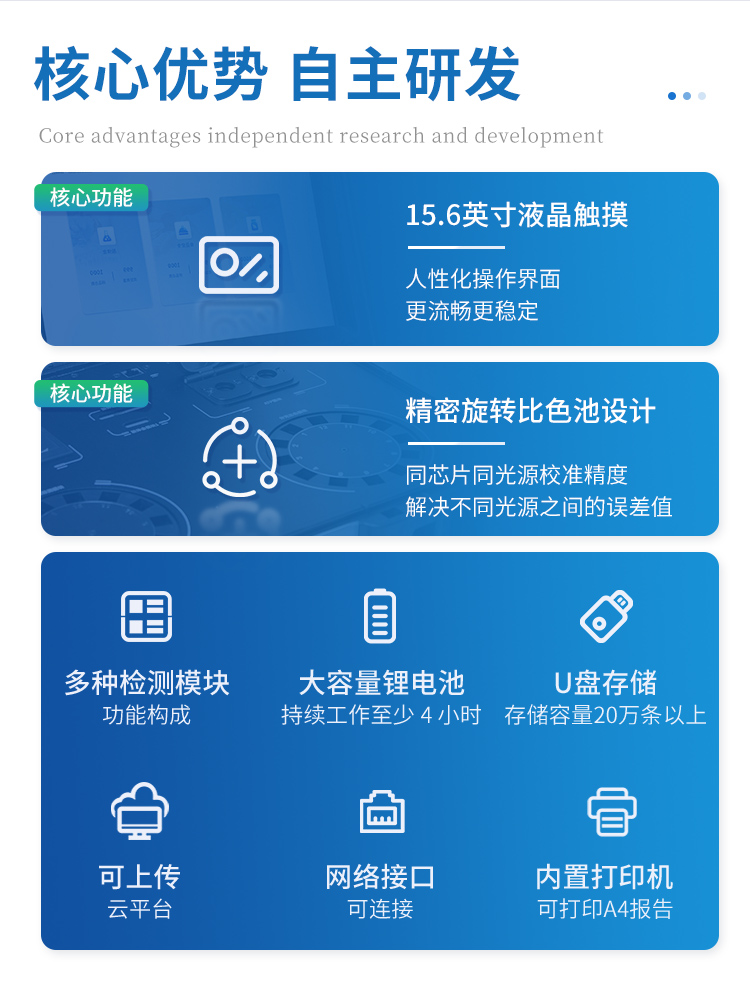 | 功能構(gòu)成:主要包括分光光度模塊、新型農(nóng)殘檢測(cè)模塊、膠體金檢測(cè)模塊、熒光檢測(cè)模塊、數(shù)字化管理模塊等,所有模塊集成一體,可快速檢測(cè)200多種食品安全項(xiàng)目,如獸藥殘留、農(nóng)藥殘留、非法添加劑、細(xì)菌數(shù)值等指標(biāo)。 | 檢測(cè)樣品種類:餐具及廚房用品、瓜果蔬菜及其制品、水產(chǎn)品及其制品、畜禽產(chǎn)品及其制品、嬰幼兒乳品及奶粉制品、蜂蜜、糧油及其制品、調(diào)味品(食醋、醬油、味精、鹽等)、酒類茶葉及其制品、食用菌、飲料、蛋類藥物殘留(雞蛋,鴨蛋等)、米豆面制品、糖果糕點(diǎn)類(小食品)、薯類及膨化食品、瓶(桶)裝飲用水、添加食用色素的食品、使用添加劑的食品、含有有毒有害物質(zhì)的相關(guān)食品。 | 顯示屏幕:儀器采用15.6英寸液晶觸摸屏顯,搭配運(yùn)行安卓智能操作系統(tǒng),主控芯片采用ARM Cortex-A7,RK3288/4核處理器,主頻1.88Ghz,操作方便,性能更強(qiáng)。 | 供電模式:儀器交直流兩用,直流12V供電,可連接車載電源,配18ah大容量充電鋰電池,電量可實(shí)時(shí)顯示,無(wú)外部電源條件下可持續(xù)工作至少 4 小時(shí)。 | 檢測(cè)通道:≥24通道;采用精密旋轉(zhuǎn)比色池設(shè)計(jì),使用同芯片同光源校準(zhǔn)精度,解決不同光源之間的誤差值,更加準(zhǔn)確**,采用高精度進(jìn)口四波長(zhǎng)冷光源,每個(gè)通道均配置 410、520、590、630nm 波長(zhǎng)光源,標(biāo)配**的光路切換裝置,**光路切換功能可實(shí)現(xiàn)64波長(zhǎng),并且所有檢測(cè)項(xiàng)目可實(shí)現(xiàn)所有通道同時(shí)檢測(cè). | 通訊接口:配備無(wú)線通信模塊、4G(APN)通訊模塊、藍(lán)牙傳輸,同時(shí)具有雙USB接口以及RJ45網(wǎng)線接口,可以多方式實(shí)現(xiàn)數(shù)據(jù)保存及數(shù)據(jù)傳輸。 | 存儲(chǔ)方式:支持U盤存儲(chǔ),兩個(gè)標(biāo)準(zhǔn)USB接口,免驅(qū)動(dòng)安裝。檢測(cè)結(jié)果存儲(chǔ)容量20萬(wàn)條以上,可生成Excel表格進(jìn)行拷貝,并具有登錄保護(hù)功能。 | 操作系統(tǒng):儀器可在同一檢測(cè)界面自動(dòng)對(duì)應(yīng)相關(guān)檢測(cè)通道,一次性選擇不少于11個(gè)樣品名稱,無(wú)需退出界面,節(jié)省操作時(shí)間。并可以對(duì)每個(gè)通道屬性和樣品信息單獨(dú)進(jìn)行編輯,例如送檢單位、人員,檢測(cè)人員等,打印時(shí)勾選打印顯示。 | 數(shù)據(jù)集成系統(tǒng):設(shè)備首頁(yè)自動(dòng)匯總分析檢測(cè)數(shù)據(jù),包含:周檢測(cè)數(shù)據(jù)、月檢測(cè)數(shù)據(jù),全部檢測(cè)總數(shù)量,包含檢測(cè)總數(shù),合格數(shù),不合格數(shù),以及相關(guān)柱形分析圖,各項(xiàng)檢測(cè)數(shù)據(jù)一目了然,無(wú)需電腦查詢,更加快捷直觀。 | 數(shù)據(jù)庫(kù)系統(tǒng):十幾項(xiàng)數(shù)據(jù)庫(kù)分類管理儀器:包含項(xiàng)目類型、項(xiàng)目數(shù)據(jù)、檢測(cè)數(shù)據(jù)、歷史記錄、國(guó)標(biāo)信息、曲線信息、采樣信息、檢測(cè)信息、受檢信息、復(fù)核信息、圖表信息、光源校準(zhǔn)信息、打印樣式信息、樣品庫(kù)信息等等,數(shù)據(jù)庫(kù)之間互相協(xié)調(diào)聯(lián)動(dòng)保證數(shù)據(jù)的真實(shí)完整性。同時(shí)產(chǎn)品數(shù)據(jù)庫(kù)以及歷史檢測(cè)記錄支持一鍵檢索功能。 | 限量規(guī)判系統(tǒng):具有限量查詢、添加物質(zhì)合規(guī)判定系統(tǒng)。檢測(cè)出結(jié)果后,系統(tǒng)自動(dòng)調(diào)用系統(tǒng)數(shù)據(jù)庫(kù)中相關(guān)國(guó)標(biāo)進(jìn)行比對(duì)判定,客觀顯示判定結(jié)果是否合格。 | 項(xiàng)目預(yù)設(shè)系統(tǒng):儀器具有任務(wù)預(yù)設(shè)模塊,一鍵提前預(yù)設(shè),給出方便快捷的新檢測(cè)方案,每一個(gè)任務(wù)分別可以設(shè)置不同的樣品、批次、編號(hào)、來(lái)源、備注、抽樣信息、檢測(cè)信息、受檢信息、復(fù)核信息等更多信息。樣品送檢時(shí)一鍵調(diào)取保存信息,并可多次調(diào)取,適用于大批量檢測(cè)業(yè)務(wù),可以大大提高檢測(cè)效率。 | 數(shù)據(jù)監(jiān)管系統(tǒng):同步對(duì)接監(jiān)管平臺(tái),數(shù)據(jù)可局域網(wǎng)和互聯(lián)網(wǎng)數(shù)據(jù)上傳,檢測(cè)結(jié)果可直接傳至食品安全監(jiān)管平臺(tái)。進(jìn)行區(qū)域食品安全監(jiān)管及大數(shù)據(jù)分析處理與數(shù)據(jù)統(tǒng)計(jì),監(jiān)測(cè)區(qū)域食品安全長(zhǎng)短期動(dòng)態(tài)及問題預(yù)估、預(yù)警 | 全新打印系統(tǒng):內(nèi)置全新打印機(jī),新創(chuàng)自定義打印方式,可按需靈活勾選控制:產(chǎn)品合格證(國(guó)家農(nóng)業(yè)部標(biāo)準(zhǔn)要求),二維碼,抽樣信息、檢測(cè)信息,受檢信息、復(fù)核信息、抽樣日期、檢測(cè)日期等信息的打印。 | A4紙版本報(bào)告打印功能:設(shè)備擁有兩種結(jié)果展示方式,可以自動(dòng)生成A4打印模板和小票打印模板兩種樣式,可通過WiFi及網(wǎng)線等方式連接外置打印機(jī)可進(jìn)行打印。 | 膠體金檢測(cè)模塊:采用單通道CMOS成像處理技術(shù)及膠體金免疫層析技術(shù),可讀取膠體金卡數(shù)據(jù),自動(dòng)采集、處理分析,將檢測(cè)結(jié)果顯示,并可根據(jù)參考限值自動(dòng)