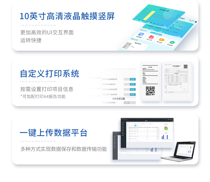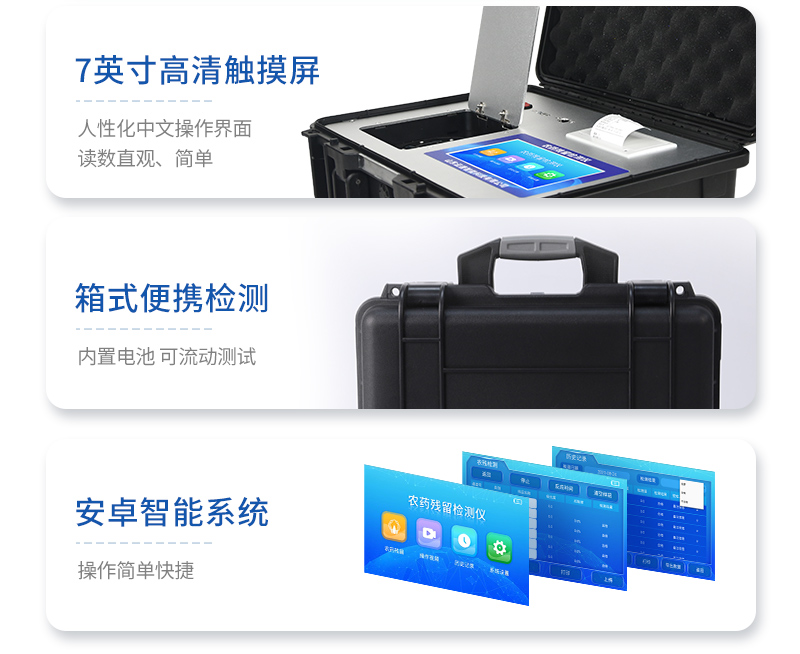 | 儀器采用臺式一體化系統(tǒng)檢測技術,新型農(nóng)殘檢測模塊、數(shù)字化管理模塊、無線通訊模塊高度集成于一體,同時預留升級檢測方法。 | 儀器檢測模塊標準化、智能化,可隨意自由組合。檢測箱體內(nèi)置多個標準檢測單元,檢測模塊可以調(diào)整配置。 | 儀器采用全新安卓智能系統(tǒng),主控芯片采用 ARM Cortex-A7,RK3288/4核處理器,10.1寸高清液晶觸摸豎屏,更加**的UI交互界面,運轉快捷;儀器配備無線通信模塊: 4G(APN)通訊模塊、Wifi模塊,藍牙傳輸,同時具有雙USB接口以及RJ45接口能以多種方式實現(xiàn)數(shù)據(jù)保存和數(shù)據(jù)傳輸功能。 | 創(chuàng)新檢測模式:檢測通道:≥24通道;采用精密旋轉比色池設計,使用同芯片同光源校準精度,解決不同光源之間的誤差值。1-12通道間誤差0.1%。(**號:ZL202022821055.2) 儀器具有自動識別比色皿檢測功能,即:將樣品比色皿放入儀器后,點擊樣品檢測,儀器自動識別比色皿進行通道檢測。 | 進口高精光源:高精度進口四波長冷光源,通道配置 410、520、590、630nm 波長光源,一個光源芯片驅動一個光源,誤差極小,每臺設備單獨**校準光源,**比對,同時參照四種不同波段光源全方位覆蓋市面上99%的農(nóng)殘食品項目檢測,可按照實際需求進行食品項目檢測升級。 | 高精光源系統(tǒng): ①儀器光源采用進口超高亮發(fā)光二極管,光源亮度可以自動調(diào)節(jié)與校準 ②智能恒流穩(wěn)壓,光強自動校準,長時間連續(xù)工作光源無溫漂現(xiàn)象。 | 智能操作分析系統(tǒng): | 便捷操作系統(tǒng):設備檢測時可在同一檢測界面自動對應相關檢測通道一次性選擇1-24個樣品名稱,無須退出界面,節(jié)省操作時間。 | 數(shù)據(jù)集成系統(tǒng):設備首頁自動統(tǒng)計檢測數(shù)據(jù)包含:周檢測數(shù)據(jù)、月檢測數(shù)據(jù),全部檢測總數(shù)量,均包含檢測總數(shù),合格數(shù),不合格數(shù),以及相關柱形分析圖,對各項檢測數(shù)據(jù)清晰掌握,無需電腦查詢,更加快捷直觀。 | 項目預設系統(tǒng):支持添加單個及多個相同或不相同的任務預設,一鍵快速調(diào)取,每一個任務分別可以設置不同的樣品、批次、編號、來源、備注、抽樣信息、檢測信息、受檢信息、復核信息等更多信息。 | 數(shù)據(jù)監(jiān)管系統(tǒng):同步對接監(jiān)管平臺,數(shù)據(jù)可局域網(wǎng)和互聯(lián)網(wǎng)數(shù)據(jù)上傳,檢測結果可選擇直接傳至食品安全監(jiān)管平臺。集成OSS輸出存儲服務、區(qū)分設備定向管理應用,進行區(qū)域食品安全監(jiān)管及大數(shù)據(jù)分析處理與數(shù)據(jù)統(tǒng)計,檢測區(qū)域食品安全長短期動態(tài),達到食品安全問題預估、預警。 | 自定義打印系統(tǒng):內(nèi)置新創(chuàng)自定義打印系統(tǒng),可按需靈活設置開啟或關閉:產(chǎn)品合格證(國家農(nóng)業(yè)部標準),二維碼,抽樣信息、檢測信息,受檢信息、復核信息、抽樣日期、檢測日期等信息的打印。 | A4版本報告打印功能:設備可自動生成A4版報告,外接打印機即可打印 | 系統(tǒng)遠程更新功能:可定向分客戶分儀器更新系統(tǒng),按照不同客戶后期實際需求添加項目,無需設備返廠,即可遠程實時升級全新系統(tǒng),節(jié)省時間成本及避免運輸造成設備損壞。 | 安全證書,放心保障:儀器具有中國計量科學研究院校準證書,**認證。 |