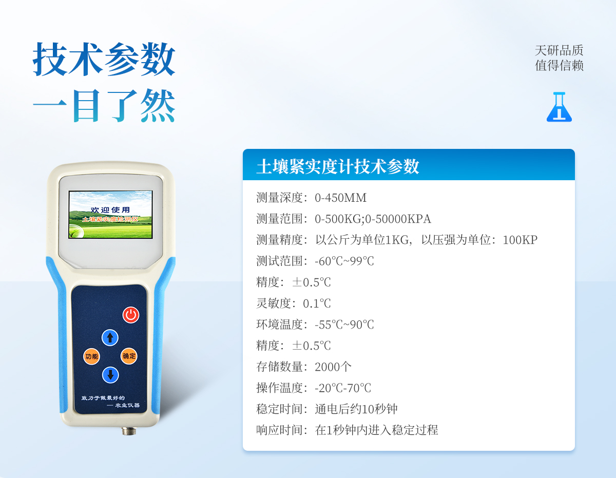 | *測(cè)量深度:0-450mm .測(cè)量范圍:0-500kg;0-50000kpa | *緊實(shí)度參數(shù):測(cè)量精度:以公斤為單位1Kg,以壓強(qiáng)為單位:100Kp; | *溫度參數(shù):測(cè)試范圍:-60℃~99℃,精度:±0.5℃;靈敏度:0.1℃ | *環(huán)境溫度:-55℃~90℃ 精度:±0.5℃?!?/td> | *存儲(chǔ)數(shù)量:2000個(gè) | *操作溫度:-20℃-70℃ | *穩(wěn)定時(shí)間:通電后約10秒鐘; .響應(yīng)時(shí)間:在1秒鐘內(nèi)進(jìn)入穩(wěn)定過(guò)程; |