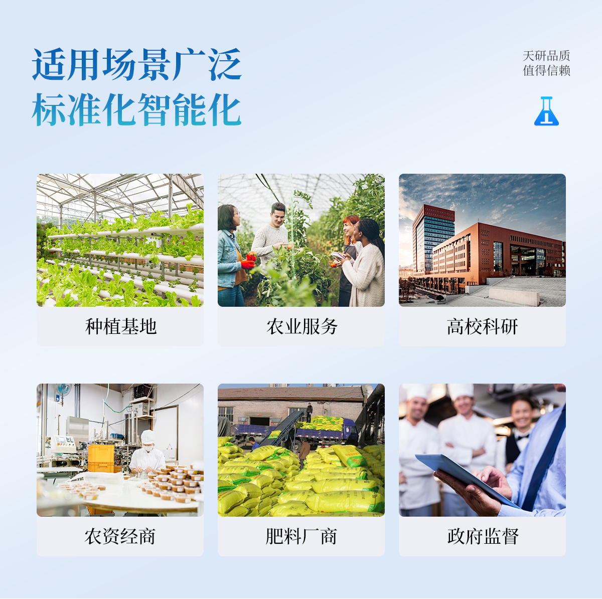 | 土壤養(yǎng)分:土壤銨態(tài)氮、土壤有效磷、土壤速效鉀、土壤硝態(tài)氮、土壤水解氮、土壤全氮、土壤全磷、土壤全鉀、土壤有機(jī)質(zhì)(丘林法)、土壤有機(jī)質(zhì)(浸提法)、土壤總有機(jī)碳、土壤碳氮比、PH值、含鹽量、水分。 | 土壤中微量元素:土壤鈣、土壤鎂、土壤硫、土壤硅、土壤硼、土壤鐵、土壤銅、土壤錳、土壤鋅、土壤氯、土壤鉬; | 土壤重金屬:土壤鉛、土壤砷、土壤鎘、土壤鉻、土壤汞、土壤鎳、土壤鋁、土壤氟、土壤鈦、土壤硒。 |