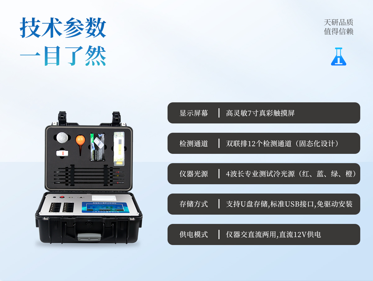 | 配套齊全:該儀器集藥、器、儀為一體,攜帶方便,相當(dāng)于一個(gè)小型移動(dòng)實(shí)驗(yàn)室,無需用戶自配附件,亦可靈活野外流動(dòng)測(cè)試。適于農(nóng)業(yè)服務(wù)部門或農(nóng)資經(jīng)銷商、合作社、肥料廠商、大種植戶測(cè)土施肥。 | 檢測(cè)功能全:測(cè)試項(xiàng)目國(guó)內(nèi)外全面,除標(biāo)配試劑外,其他各類藥劑均可加配選購(gòu)。 | 操作簡(jiǎn)便、速度快捷,配套整套附件及成品藥劑開瓶即用,無須配置。 |