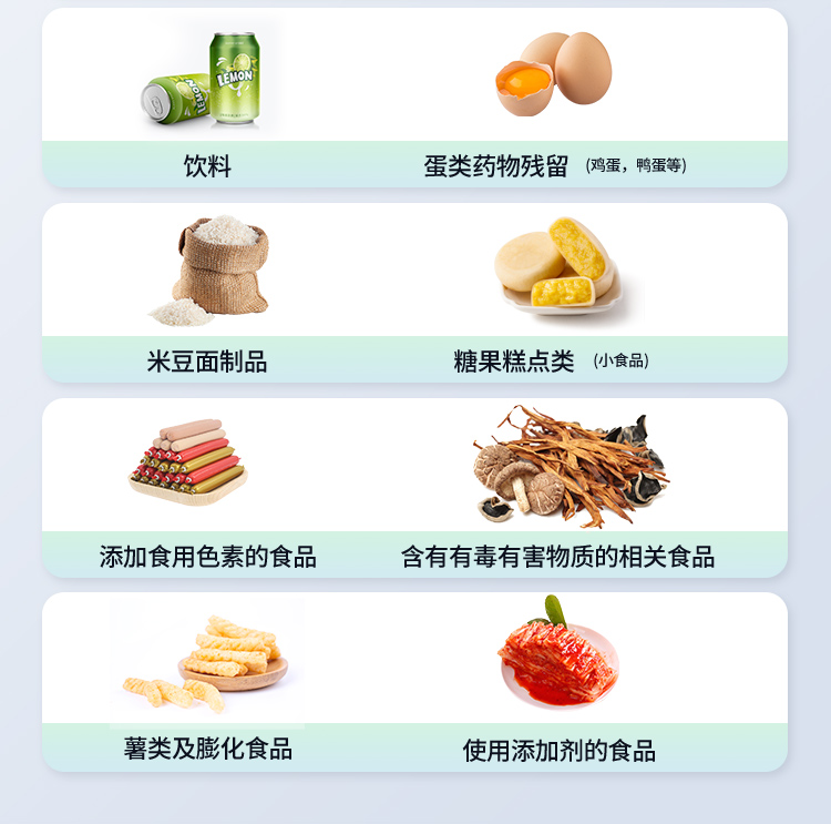 | 食品添加劑:二氧化硫、雙氧水、亞硝酸鹽、硝酸鹽、苯甲酸鈉、山梨酸鉀、糖精鈉、甜蜜素、木耳硫酸鎂等 | 有毒有害物質(zhì):甲醛、吊白塊、硼砂、過氧化苯甲酰、溴酸鉀、羅丹明B、三聚氰胺、蘇丹紅、工業(yè)堿、尿素、明礬等 | 果蔬:農(nóng)藥殘留(酶抑制率法) | 病害肉:組胺、揮發(fā)性鹽基氮 | 重金屬含量:鉛、鎘、鉻、汞、砷、錫、鎳、鋁等 | 水產(chǎn)品安全類:孔雀石綠、氯霉素、呋喃妥因、呋喃西林、呋喃它酮、呋喃唑酮等 | 瘦肉精激素類(獸藥):鹽酸克倫特羅、沙丁胺醇、萊克多巴胺、己烯雌酚等 | 抗生素殘留:四環(huán)素類、硝基呋喃類、磺胺類、β-興奮劑類、沙星類、磺胺類、喹諾酮類,甲砜霉素,氟苯尼考,金剛烷胺、替米考星、慶大霉素、林可霉素、鏈霉素、恩諾沙星、環(huán)丙沙星、頭孢啦啶、青霉素、阿莫西林等 | 真菌毒素類:食用油、糧食及飼料中黃曲霉毒素B1、黃曲霉毒素總量,奶中黃曲霉毒素M1、嘔吐毒素、玉米赤霉烯酮、赭曲霉毒素A、T2毒素、伏馬毒素等 | 水酒飲品分析:乳品及牛奶中蛋白質(zhì);酒中甲醇、乙醇、雜醇油;蜂蜜中果糖和葡萄糖、蔗糖、淀粉酶、酸度;水中氰化物、余氯,飲料中維C等 | 調(diào)味品成分: 食醋的總酸、醬油的總酸、芝麻油純度、谷氨酸鈉、醬油氨基酸態(tài)氮、食鹽中亞鐵氰化鉀、食鹽中碘等 | 食用色素類:紅色色素(胭脂紅、莧菜紅、莧菜紅)、黃色色素(檸檬黃、日落黃)、藍(lán)色色素(亮藍(lán))等 | 動(dòng)物疫病類:禽流感、新城疫、牛羊口蹄疫、牛羊結(jié)核病、牛羊包蟲、牛羊布病、小反芻獸、豬藍(lán)耳病毒、豬瘟病毒、豬偽狂犬病毒、豬細(xì)小、豬圓環(huán)、犬細(xì)小病毒、犬瘟熱病毒、犬狂犬病毒等 | 蜂蜜成分:果糖和葡萄糖、蔗糖、淀粉酶、酸度等 | 水產(chǎn)品安全類:孔雀石綠、氯霉素、呋喃妥因、呋喃西林、呋喃它酮、呋喃唑酮等 | 食用油脂:過氧化值、酸價(jià)等 | 蛋類藥物殘留:氯霉素,四環(huán)素,磺胺類,喹諾酮類,呋喃西林,呋喃它酮,呋喃妥因,呋喃唑酮,氟苯尼考,阿莫西林、頭孢氨芐、紅霉素、鏈霉素等 |