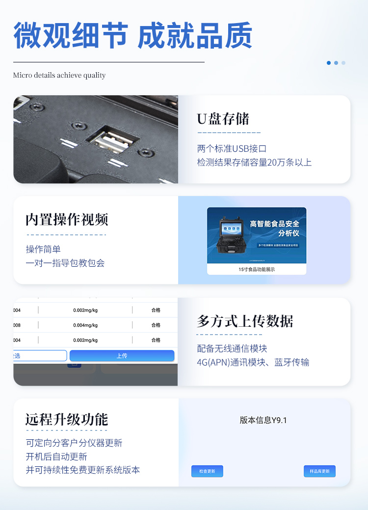 | 儀器采用臺(tái)式一體化系統(tǒng)檢測(cè)技術(shù),將分光光度模塊、膠體金檢測(cè)模塊、新型農(nóng)殘檢測(cè)模塊、數(shù)字化管理模塊、無線通訊模塊高度集成于一體,支持檢測(cè)200種食品安全檢測(cè)項(xiàng)目,同時(shí)預(yù)留升級(jí)檢測(cè)方法。 | 儀器檢測(cè)模塊標(biāo)準(zhǔn)化、智能化,檢測(cè)項(xiàng)目可隨意自由組合。檢測(cè)箱體內(nèi)置多個(gè)標(biāo)準(zhǔn)檢測(cè)單元,檢測(cè)模塊可以調(diào)整配置。 | 顯示屏幕:儀器采用10.1英寸豎向液晶觸摸屏顯,搭配運(yùn)行安卓智能操作系統(tǒng),主控芯片采用ARM Cortex-A7,RK3288/4核處理器,主頻1.88Ghz,操作方便,性能更強(qiáng)。 | 檢測(cè)通道:≥12通道;采用精密旋轉(zhuǎn)比色池設(shè)計(jì),使用同芯片同光源校準(zhǔn)精度,解決不同光源之間的誤差值,更加準(zhǔn)確**。(1-12通道間誤差0.1%,**號(hào):ZL202022821055.2) | 儀器光源:高精度進(jìn)口四波長(zhǎng)冷光源,每個(gè)通道均配置 410、520、590、630nm 波長(zhǎng)光源,標(biāo)配**的光路切換裝置,**光路切換功能可實(shí)現(xiàn)64波長(zhǎng),并且所有檢測(cè)項(xiàng)目可實(shí)現(xiàn)所有通道同時(shí)檢測(cè)。 | 設(shè)備可一鍵校準(zhǔn),自動(dòng)保存校準(zhǔn)數(shù)據(jù),自動(dòng)對(duì)比校驗(yàn),得到精準(zhǔn)光源,采用Android SP存儲(chǔ)數(shù)據(jù),光源數(shù)據(jù)永不丟失,方便每一次使用。 | 通訊接口:配備無線通信模塊、可選配4G(APN)通訊模塊和藍(lán)牙傳輸,同時(shí)具有雙USB接口以及RJ45網(wǎng)線接口,可以多方式實(shí)現(xiàn)數(shù)據(jù)保存及數(shù)據(jù)傳輸。 | 存儲(chǔ)方式:支持U盤存儲(chǔ),標(biāo)準(zhǔn)USB接口,免驅(qū)動(dòng)安裝。檢測(cè)結(jié)果存儲(chǔ)容量20萬條以上,可生成Excel表格進(jìn)行拷貝,并具有登錄保護(hù)功能。 | 智能化操作系統(tǒng): | 1、操作系統(tǒng):儀器可在同一檢測(cè)界面自動(dòng)對(duì)應(yīng)相關(guān)檢測(cè)通道,一次性選擇1-12個(gè)樣品名稱,無需退出界面,節(jié)省操作時(shí)間。并可以對(duì)每個(gè)通道屬性和樣品信息單獨(dú)進(jìn)行編輯,例如送檢單位、人員,檢測(cè)人員等,打印時(shí)勾選打印顯示。 | 2、數(shù)據(jù)集成系統(tǒng):設(shè)備首頁自動(dòng)匯總分析檢測(cè)數(shù)據(jù),包含:周檢測(cè)數(shù)據(jù)、月檢測(cè)數(shù)據(jù),全部檢測(cè)總數(shù)量,均包含檢測(cè)總數(shù),合格數(shù),不合格數(shù),以及相關(guān)柱形分析圖,各項(xiàng)檢測(cè)數(shù)據(jù)一目了然,無需電腦查詢,更加快捷直觀。 | 3、數(shù)據(jù)庫系統(tǒng):十幾項(xiàng)數(shù)據(jù)庫分類管理儀器:包含項(xiàng)目類型、項(xiàng)目數(shù)據(jù)、檢測(cè)數(shù)據(jù)、歷史記錄、國(guó)標(biāo)信息、曲線信息、采樣信息、檢測(cè)信息、受檢信息、復(fù)核信息、圖表信息、光源校準(zhǔn)信息、打印樣式信息、樣品庫信息等等,數(shù)據(jù)庫之間互相協(xié)調(diào)聯(lián)動(dòng)保證數(shù)據(jù)的真實(shí)完整性。同時(shí)產(chǎn)品數(shù)據(jù)庫以及歷史檢測(cè)記錄支持一鍵檢索功能。 | 4、限量規(guī)判系統(tǒng):具有限量查詢、添加物質(zhì)合規(guī)判定系統(tǒng)。檢測(cè)出結(jié)果后,系統(tǒng)自動(dòng)調(diào)用系統(tǒng)數(shù)據(jù)庫中相關(guān)國(guó)標(biāo)進(jìn)行比對(duì)判定,客觀顯示判定結(jié)果是否合格。 | 5、項(xiàng)目預(yù)設(shè)系統(tǒng):儀器具有任務(wù)預(yù)設(shè)模塊,一鍵提前預(yù)設(shè),給出方便快捷的新檢測(cè)方案,每一個(gè)任務(wù)分別可以設(shè)置不同的樣品、批次、編號(hào)、來源、備注、抽樣信息、檢測(cè)信息、受檢信息、復(fù)核信息等更多信息。樣品送檢時(shí)一鍵調(diào)取保存信息,并可多次調(diào)取,大大提高檢測(cè)效率。 | 6、數(shù)據(jù)監(jiān)管系統(tǒng):同步對(duì)接監(jiān)管平臺(tái),數(shù)據(jù)可局域網(wǎng)和互聯(lián)網(wǎng)數(shù)據(jù)上傳,檢測(cè)結(jié)果可選擇直接傳至食品安全監(jiān)管平臺(tái)。進(jìn)行區(qū)域食品安全監(jiān)管及大數(shù)據(jù)分析處理與數(shù)據(jù)統(tǒng)計(jì),檢測(cè)區(qū)域食品安全長(zhǎng)短期動(dòng)態(tài),達(dá)到食品安全問題預(yù)估、預(yù)警。 | 7、全新打印系統(tǒng):內(nèi)置全新打印機(jī),新創(chuàng)自定義打印方式,可按需靈活勾選控制:產(chǎn)品合格證(國(guó)家農(nóng)業(yè)部標(biāo)準(zhǔn)要求),二維碼,抽樣信息、檢測(cè)信息,受檢信息、復(fù)核信息、抽樣日期、檢測(cè)日期等信息的打印。 | 8、A4紙版本報(bào)告打印功能(可選配):設(shè)備擁有兩種結(jié)果展示方式,可以自動(dòng)生成A4打印模板和小票打印模板兩種樣式,可通過WiFi及網(wǎng)線等方式鏈接外置打印機(jī)可進(jìn)行打印。 | 10、供電模式:儀器交直流兩用,直流12V供電,可連接車載電源,可配6ah大容量充電鋰電池,電量可實(shí)時(shí)顯示,方便戶外流動(dòng)測(cè)試。 | 11、膠體金檢測(cè)模塊:采用單通道CMOS成像處理技術(shù)及膠體金免疫層析技術(shù),可讀取膠體金卡數(shù)據(jù),自動(dòng)采集、處理分析,將檢測(cè)結(jié)果顯示,并可根據(jù)參考限值自動(dòng)判斷檢測(cè)結(jié)果,可檢測(cè)常見