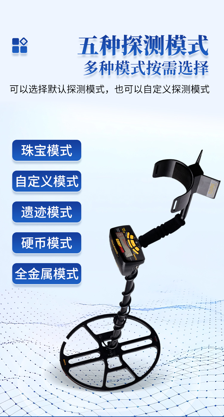 | ●探測(cè)盤:全新配置一款15存“DD”防水探測(cè)盤,可以擴(kuò)大該儀器的探測(cè)范圍 | ●識(shí)別能力:可以單項(xiàng)區(qū)分金,銀,銅,鐵等 | ●聲音識(shí)別能力:金、銀、銅、鐵的報(bào)警聲音可以完全區(qū)分 | ●高靈敏度:提高了更強(qiáng)的探測(cè)靈敏度,增加機(jī)器的探測(cè)深度 | ●耳機(jī):配置一個(gè)原廠配置的高清耳機(jī) | ●定位: 可以快速的定位地下金屬的準(zhǔn)確位置 | ●接收/拒絕:通過(guò)識(shí)別按鈕可以進(jìn)行單項(xiàng)選擇探測(cè),例如:選擇黃金,該儀器只對(duì)黃金進(jìn)行報(bào)警 | ●硬幣深度顯示:在主機(jī)的右側(cè)有個(gè)顯示小金屬的深度 | ●電量狀況顯示: 可以顯示電源現(xiàn)有的電量 | ●定位按鈕: 可以精準(zhǔn)定位金屬的位置 | ●五種探測(cè)模式: 可以選擇默認(rèn)探測(cè)模式,也可以自定義探測(cè)模式 | 珠寶模式(可以刪除鐵,找到細(xì)小的金屬,比如戒指,耳環(huán),項(xiàng)鏈等) | 自定義模式(可以單項(xiàng)選擇性探測(cè),選擇自己想要探測(cè)的金屬類型) | 遺跡模式(可以將鐵刪除,只探測(cè)有色金屬提高地下金屬探測(cè)效率) | 硬幣模式(這種識(shí)別模式的目的是排除酸性垃圾,許多拉環(huán)和標(biāo)簽紙檢) | 全金屬模式(可以探測(cè)所有的金屬、金、銀、銅、鐵等) |