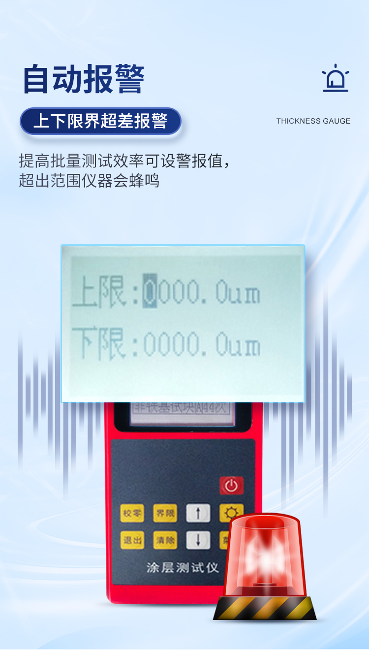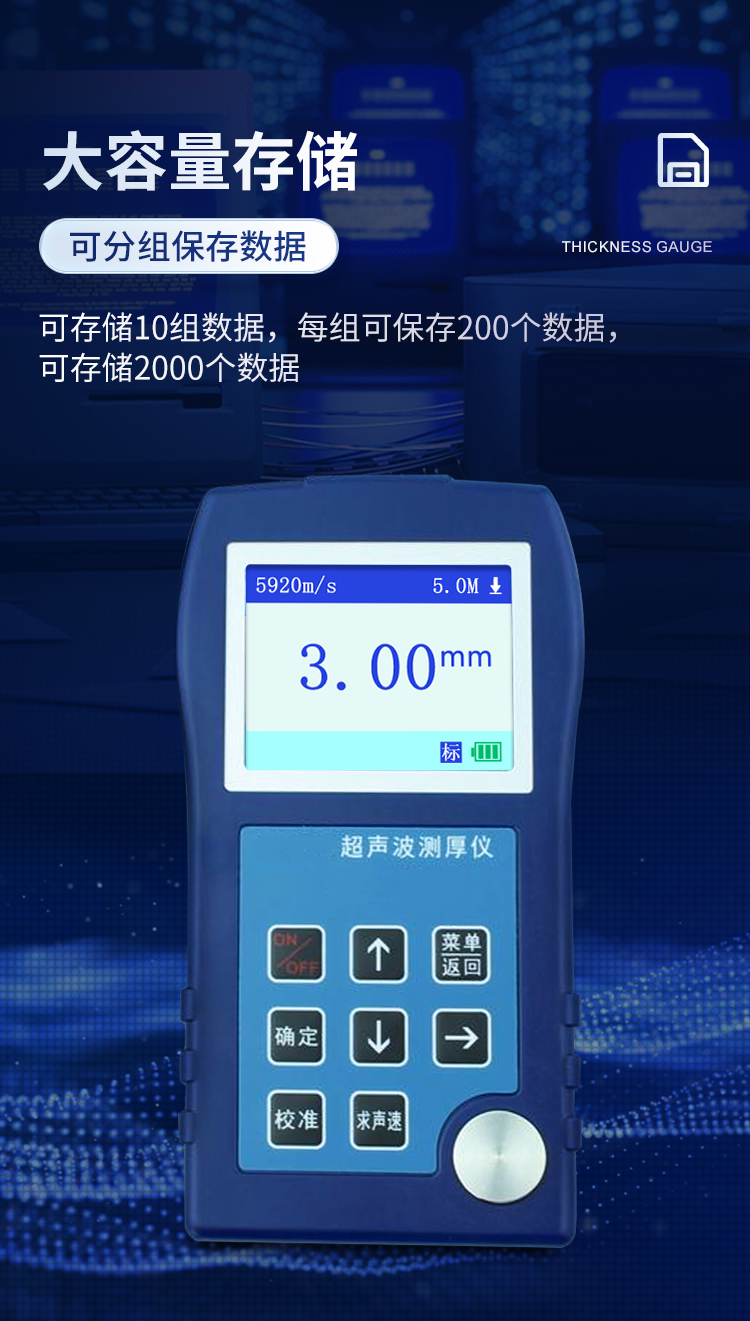 | ? 幾乎適合于所有材質(zhì)的厚度測量,如:金屬,玻璃,塑料等材料; | ?儀器精美,小巧,直觀,采用2.3寸大彩屏顯示,手持式攜帶方便,適合現(xiàn)場檢測 | ? 兩種測量模式:標(biāo)準(zhǔn)模式/穿透模式(穿透型專用) | ? 測量精度高,測量范圍大,一個(gè)標(biāo)準(zhǔn)探頭完成全量程 | ?中英文雙語言版本 | ?藍(lán)牙互聯(lián)數(shù)據(jù)傳輸功能(適用于藍(lán)牙版測厚儀) | ?校準(zhǔn):探頭標(biāo)準(zhǔn)塊校準(zhǔn),聲速校準(zhǔn),可通過已知厚度求聲速, 通過方向鍵自由調(diào)整數(shù)值 | ? 手動(dòng)關(guān)機(jī)和自動(dòng)關(guān)機(jī)兩種,用戶可隨意選擇; | ? 內(nèi)置7種常用材料的聲速,并可編輯,方便用戶使用; | ? 人性化數(shù)據(jù)保存模式:大容量存儲(chǔ),并且可分組保存數(shù)據(jù),可存儲(chǔ)10組數(shù)據(jù),每組可保存200個(gè)數(shù)據(jù),可存儲(chǔ)2000個(gè)數(shù)據(jù),手動(dòng)保存更有自主性,利于結(jié)果分析; | ?大容量存儲(chǔ),查看,刪除操作,方便簡單 | ? 多探頭配合使用,高溫環(huán)境測量可選配高溫探頭耐高溫(300℃) |