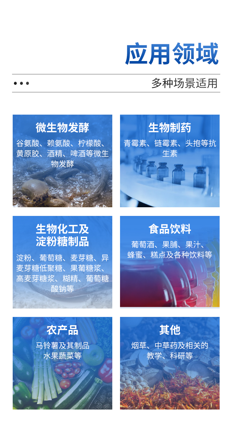 | 微生物發(fā)酵:谷氨酸、賴氨酸、檸檬酸、黃原膠、酒精、啤酒等微生物發(fā)酵 | 生物制藥:青霉素、鏈霉素、頭抱等抗生素 。生物化工及淀粉糖制品: | 淀粉、葡萄糖、麥芽糖、異麥芽糖低聚糖、果葡糖漿、高麥芽糖漿、糊精、葡萄糖酸鈉等。 | 食品飲料:葡萄酒、果脯、果汁、蜂蜜、糕點(diǎn)及各種飲料等。馬鈴薯及其制品、水果 | 蔬菜等農(nóng)產(chǎn)品 | 其他:煙草、中草藥及相關(guān)的教學(xué)、科研等 |