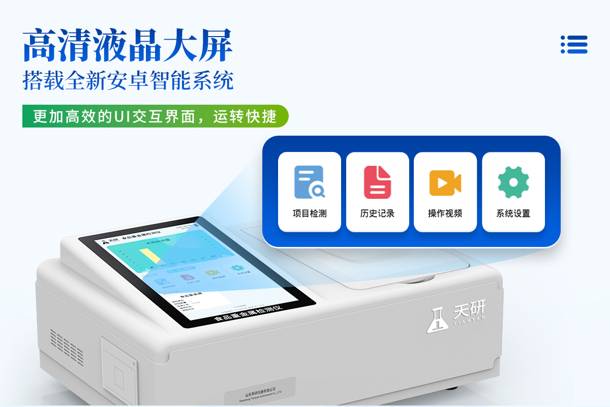 | 儀器采用臺式一體化系統(tǒng)檢測技術(shù),將分光光度模塊、數(shù)字化管理模塊、無線通訊模塊高度集成于一體,同時預留升級檢測方法 | 儀器檢測模塊標準化、智能化,檢測項目可隨意自由組合。檢測箱體內(nèi)置多個標準檢測單元,檢測模塊可以調(diào)整配置。 | 顯示屏幕:儀器采用7英寸液晶觸摸屏,搭配運行安卓智能操作系統(tǒng),主控芯片采用ARM Cortex-A7,RK3288/4核處理器,主頻1.88Ghz,操作方便,性能更強。 | 檢測通道:12通道;采用精密旋轉(zhuǎn)比色池設計,使用同芯片同光源校準精度,解決不同光源之間的誤差值,更加準確**。 | 儀器光源:高精度進口四波長冷光源,每個通道均配置 410、520、590、630nm 波長光源,標配**的光路切換裝置,光路切換功能可實現(xiàn)64波長,并且所有檢測項目可實現(xiàn)所有通道同時檢測。 | 通訊接口:配備無線通信模塊、可選配4G(APN)通訊模塊和藍牙傳輸,同時具有USB接口,可以多方式實現(xiàn)數(shù)據(jù)保存及數(shù)據(jù)傳輸。 | 存儲方式:支持U盤存儲,標準USB接口,免驅(qū)動安裝。檢測結(jié)果存儲容量20萬條以上,可生成Excel表格進行拷貝,并具有登錄保護功能。 | 智能化操作系統(tǒng): | 操作系統(tǒng):儀器可在同一檢測界面自動對應相關(guān)檢測通道,一次性選擇1-12個樣品名稱,無需退出界面,節(jié)省操作時間。并可以對每個通道屬性和樣品信息單獨進行編輯,例如送檢單位、人員,檢測人員等,打印時勾選打印顯示。 | 限量規(guī)判系統(tǒng):具有限量查詢、添加物質(zhì)合規(guī)判定系統(tǒng)。檢測出結(jié)果后,系統(tǒng)自動調(diào)用系統(tǒng)數(shù)據(jù)庫中相關(guān)國標進行比對判定,客觀顯示結(jié)果是否合格。 | 數(shù)據(jù)監(jiān)管系統(tǒng):同步對接監(jiān)管平臺,數(shù)據(jù)可局域網(wǎng)和互聯(lián)網(wǎng)數(shù)據(jù)上傳,檢測結(jié)果可選擇直接傳至食品安全監(jiān)管平臺。進行區(qū)域食品安全監(jiān)管及大數(shù)據(jù)分析處理與數(shù)據(jù)統(tǒng)計,檢測區(qū)域食品安全長短期動態(tài),達到食品安全問題預估、預警。 | 供電模式:儀器交直流兩用,直流12V供電(標配),可連接車載電源,亦可選配6ah大容量充電鋰電池,電量可實時顯示,方便戶外流動測試。 | 儀器具有重新校準、鎖定、恢復出廠設置功能 |