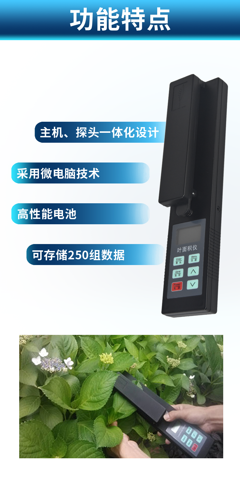 | 1)主機、探頭一體化設計,更方便操作。 | 2)采用微電腦技術,LCD大液晶顯示。 | 3)高性能電池,無需外部供電,低電壓顯示,更適用于野外測量。 | 4)一次性可測量較大葉片面積(1000*155mm2) | 5)可存儲250組數(shù)據(jù)(葉面積、葉長、葉寬)。 | 6)可測量葉片的多種參數(shù):葉面積、平均葉面積、葉長、葉寬。 | 7)通訊接口:RSR232接口,可將數(shù)據(jù)導入計算機。(此功能只限B和G型) | 8)GPS定位:集成高速GPS定位模塊,上傳數(shù)據(jù)都自帶時間、經(jīng)緯度信息,方便更有效的 |