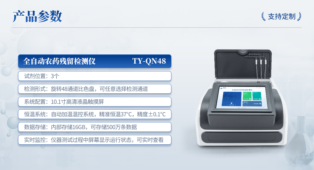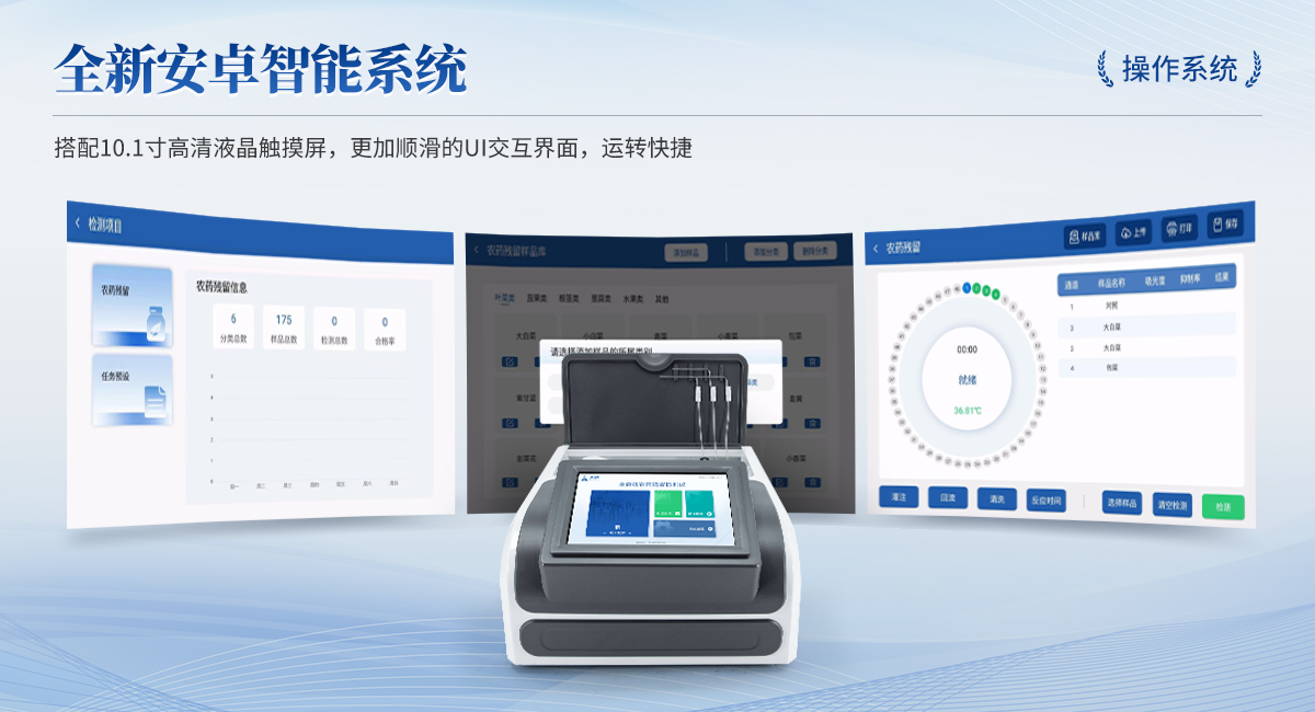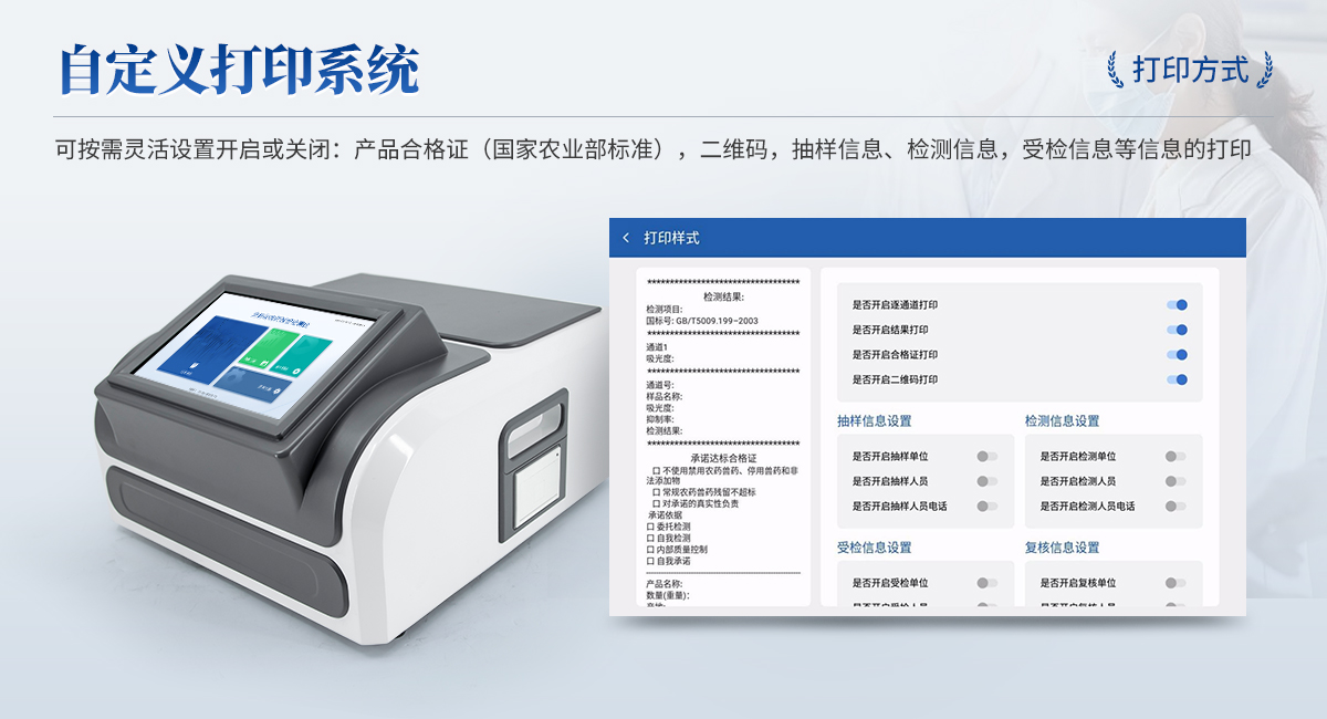 | 1. 試劑位置:3個(gè) | 2. 檢測(cè)形式:旋轉(zhuǎn)48通道比色盤,可任意選擇檢測(cè)通道,自動(dòng)對(duì)應(yīng)選擇通道。 | 3. 系統(tǒng)配置:10.1寸高清液晶觸摸屏,采用ARM Cortex-A7,RK3288/4核處理器,運(yùn)行內(nèi)存1GB。Android7.1.1 系統(tǒng)分辨率1280×800。 | 4.恒溫系統(tǒng):具有自動(dòng)加溫溫控系統(tǒng),精準(zhǔn)恒溫37℃,精度±0.1℃。 | 5.添加系統(tǒng):儀器按照試劑要求自動(dòng)、按時(shí)、按量加入試劑,并且自動(dòng)對(duì)未正常放置的樣本或異常的樣本進(jìn)行檢查并提示。 | 6.清洗功能:儀器具備回流及自動(dòng)清洗管路功能,避免試劑污染。 | 7.混勻功能:設(shè)備具備自動(dòng)混勻功能。 | 8.光源校準(zhǔn):設(shè)備可自動(dòng)校準(zhǔn),確保檢測(cè)準(zhǔn)確度。 | 9.實(shí)時(shí)監(jiān)控:儀器測(cè)試過程中屏幕顯示運(yùn)行狀態(tài),可實(shí)時(shí)查看。 | 10.數(shù)據(jù)存儲(chǔ):內(nèi)部存儲(chǔ)16GB,可存儲(chǔ)500萬條數(shù)據(jù)。 | 11.樣品多選功能:設(shè)備具備樣品一鍵多選功能,選擇樣品自動(dòng)匹配檢測(cè)通道。 | 12.項(xiàng)目預(yù)設(shè):可提前設(shè)置單個(gè)及多個(gè)相同或不相同的檢測(cè)任務(wù),可單次或者多次調(diào)取,減少檢測(cè)時(shí)間。 | 13.自定義打印系統(tǒng):內(nèi)置自定義打印系統(tǒng),可按需靈活設(shè)置開啟或關(guān)閉:產(chǎn)品合格證(國家農(nóng)業(yè)部標(biāo)準(zhǔn)),二維碼,抽樣信息、檢測(cè)信息,受檢信息等信息的打印。 | 14.A4版本報(bào)告打印功能:設(shè)備可自動(dòng)生成A4版報(bào)告,A4報(bào)告帶二維碼,可掃描二維碼生成電子版,并可識(shí)別真?zhèn)巍?/td> | 15.傳輸方式:儀器配備無線通信模塊: 4G(APN)通訊模塊、Wifi模塊,藍(lán)牙傳輸模塊,同時(shí)具有USB接口以及RJ45接口能以多種方式實(shí)現(xiàn)數(shù)據(jù)保存和數(shù)據(jù)傳輸功能,設(shè)備數(shù)據(jù)可以同步上傳至平臺(tái)。 | 16.數(shù)據(jù)監(jiān)管系統(tǒng):設(shè)備自帶監(jiān)管平臺(tái),并可同步對(duì)接監(jiān)管平臺(tái),數(shù)據(jù)可局域網(wǎng)和互聯(lián)網(wǎng)數(shù)據(jù)上傳,檢測(cè)結(jié)果可直接傳至食品安全監(jiān)管平臺(tái)。達(dá)到食品安全問題預(yù)估、預(yù)警。 | 17.系統(tǒng)遠(yuǎn)程更新功能:無需設(shè)備返廠,即可遠(yuǎn)程實(shí)時(shí)升級(jí)全新系統(tǒng),節(jié)省時(shí)間成本及避免運(yùn)輸造成設(shè)備損。 |