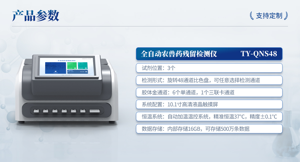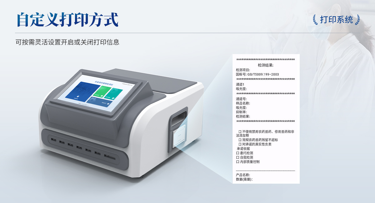 | 1. 試劑位置:3個(gè) | 2. 農(nóng)殘檢測(cè)盤:旋轉(zhuǎn)48通道比色盤,可任意選擇檢測(cè)通道,自動(dòng)對(duì)應(yīng)選擇通道。 | 3. 膠體金通道:6個(gè)單通道,1個(gè)三聯(lián)卡通道,可讀取檢測(cè)卡結(jié)果,自動(dòng)采集、處理分析,自動(dòng)判斷檢測(cè)結(jié)果,并具備自動(dòng)判空功能。 | 4.系統(tǒng)配置:10.1寸高清液晶觸摸屏,采用ARM Cortex-A7,RK3288/4核處理器,運(yùn)行內(nèi)存1GB。Android7.1.1 系統(tǒng)分辨率1280×800。 | 5.恒溫系統(tǒng):具有自動(dòng)加溫溫控系統(tǒng),精準(zhǔn)恒溫37℃,精度±0.1℃。 | 6.添加系統(tǒng):儀器按照試劑要求自動(dòng)、按時(shí)、按量加入試劑,并且自動(dòng)對(duì)未正常放置的樣本或異常的樣本進(jìn)行檢查并提示。 | 7.清洗功能:儀器具備回流及自動(dòng)清洗管路功能,避免試劑污染。 | 8.混勻功能:設(shè)備具備自動(dòng)混勻功能。 | 9.光源校準(zhǔn):設(shè)備可自動(dòng)校準(zhǔn),確保檢測(cè)準(zhǔn)確度。 | 10.實(shí)時(shí)監(jiān)控:儀器測(cè)試過(guò)程中屏幕顯示運(yùn)行狀態(tài),可實(shí)時(shí)查看。 | 11.數(shù)據(jù)存儲(chǔ):內(nèi)部存儲(chǔ)16GB,可存儲(chǔ)500萬(wàn)條數(shù)據(jù)。 | 12.樣品多選功能:設(shè)備具備樣品一鍵多選功能,選擇樣品自動(dòng)匹配檢測(cè)通道。 | 13.項(xiàng)目預(yù)設(shè):可提前設(shè)置單個(gè)及多個(gè)相同或不相同的檢測(cè)任務(wù),可單次或者多次調(diào)取,減少檢測(cè)時(shí)間。 | 14.自定義打印系統(tǒng):內(nèi)置自定義打印系統(tǒng),可按需靈活設(shè)置開(kāi)啟或關(guān)閉:產(chǎn)品合格證(國(guó)家農(nóng)業(yè)部標(biāo)準(zhǔn)),二維碼,抽樣信息、檢測(cè)信息,受檢信息等信息的打印。 | 15.A4版本報(bào)告打印功能:設(shè)備可自動(dòng)生成A4版報(bào)告,A4報(bào)告帶二維碼,可掃描二維碼生成電子版,并可識(shí)別真?zhèn)巍?/td> | 16.傳輸方式:儀器配備無(wú)線通信模塊: 4G(APN)通訊模塊、Wifi模塊,藍(lán)牙傳輸模塊,同時(shí)具有USB接口以及RJ45接口能以多種方式實(shí)現(xiàn)數(shù)據(jù)保存和數(shù)據(jù)傳輸功能,設(shè)備數(shù)據(jù)可以同步上傳至平臺(tái)。 | 17.數(shù)據(jù)監(jiān)管系統(tǒng):設(shè)備自帶監(jiān)管平臺(tái),并可同步對(duì)接監(jiān)管平臺(tái),數(shù)據(jù)可局域網(wǎng)和互聯(lián)網(wǎng)數(shù)據(jù)上傳,檢測(cè)結(jié)果可直接傳至食品安全監(jiān)管平臺(tái)。達(dá)到食品安全問(wèn)題預(yù)估、預(yù)警。 | 18.系統(tǒng)遠(yuǎn)程更新功能:無(wú)需設(shè)備返廠,即可遠(yuǎn)程實(shí)時(shí)升級(jí)全新系統(tǒng),節(jié)省時(shí)間成本及避免運(yùn)輸造成設(shè)備損。 |