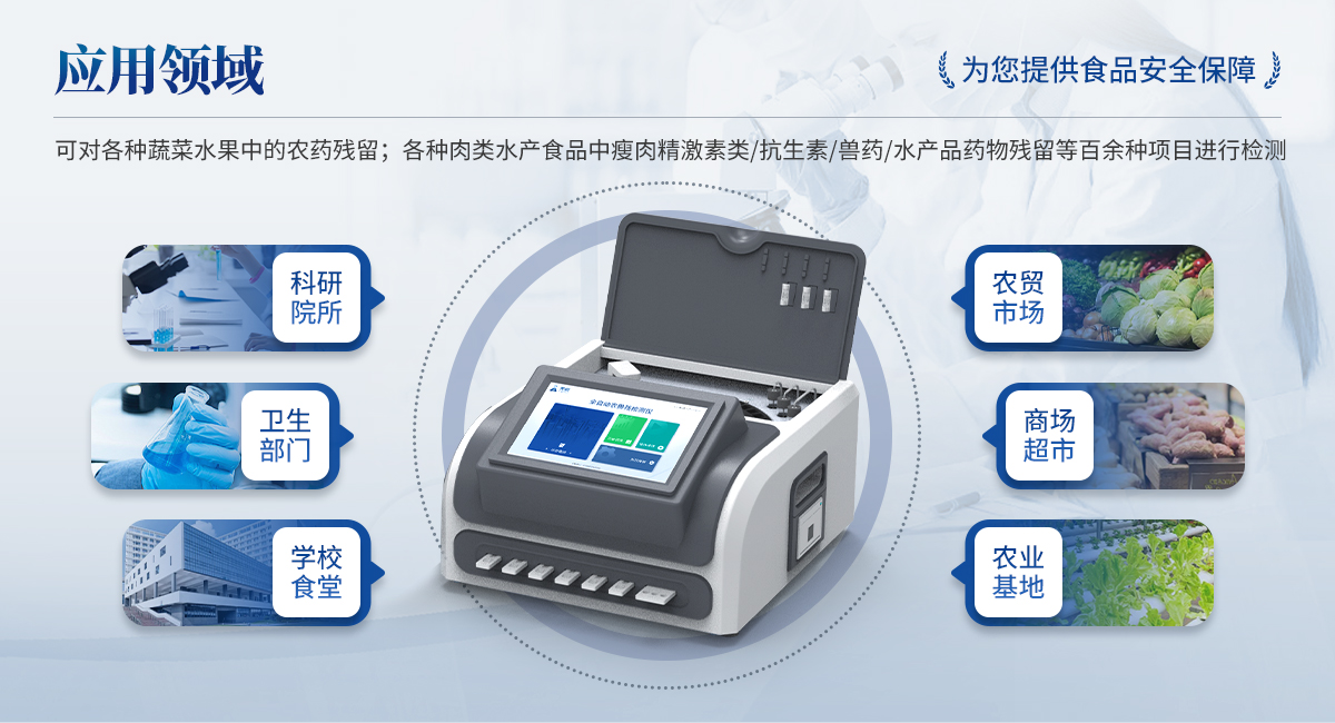全自動(dòng)農(nóng)獸藥殘留檢測(cè)儀可對(duì)各種蔬菜水果中有機(jī)磷和氨基甲酸酯類農(nóng)藥殘留;各種肉類水產(chǎn)食品中瘦肉精激素類殘留,抗生素殘留,獸藥殘留,水產(chǎn)品藥物殘留等百余種項(xiàng)目進(jìn)行快速檢測(cè)。該設(shè)備廣泛應(yīng)用于蔬菜批發(fā)市場(chǎng)、超市、商場(chǎng)、食藥監(jiān)等部門的蔬菜和水果中的農(nóng)藥殘留檢測(cè)。