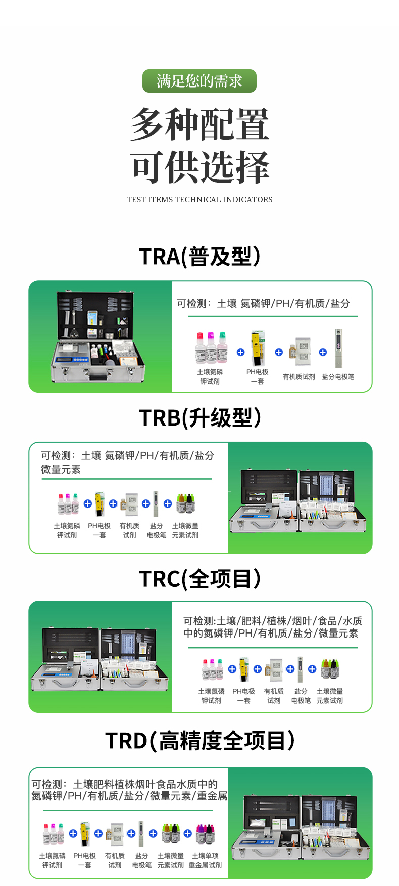 | 全項目土壤肥料養(yǎng)分檢測儀功能全:測試項目國內(nèi)外*全(各類藥劑均可選購)。 | 配套齊全:該儀器集藥、器、儀為一體,攜帶方便,相當(dāng)于一個小型實驗室。適于農(nóng)業(yè)服務(wù)部門或農(nóng)資經(jīng)銷商、肥料廠商測土施肥和鑒別肥料真假。 | 操作簡便、速度快捷,成品藥劑開瓶即用,無須配置。 |