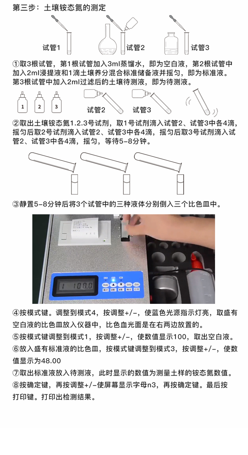 | 測一個土壤樣品(N、P、K)≤30分鐘,同時檢測三個土壤樣品(N、P、K)≤40分鐘; | 測試一個肥料樣(N、P、K)≤50分鐘,同時檢測三個肥料樣品(N、P、K)≤1.5小時。 |