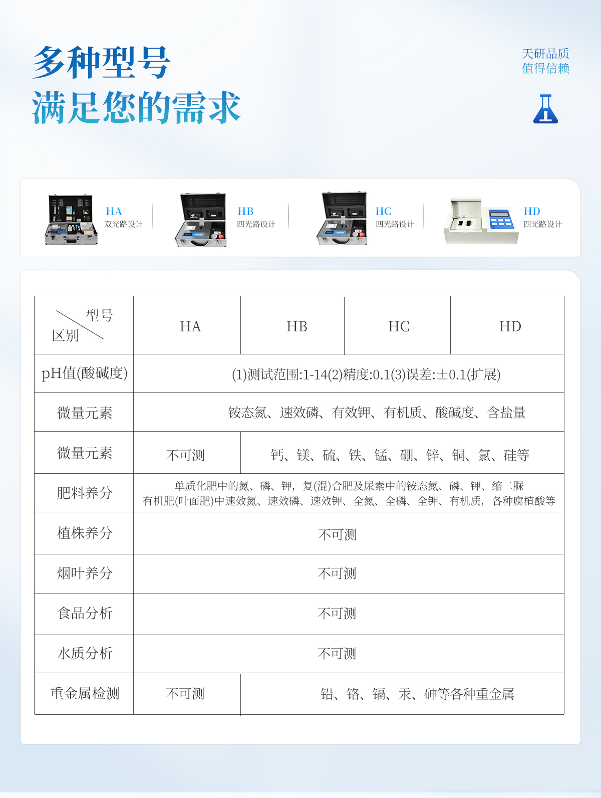 | 可同時檢測8個樣品; | 測試一個復合肥料樣(N、P、K)≤50分鐘; 每增加一個肥料樣品時間增加20分鐘。 | 測試一個有機肥料樣(N、P、K、有機質(zhì)) ≤1.5小時;每增加一個樣品加時30分鐘。 |