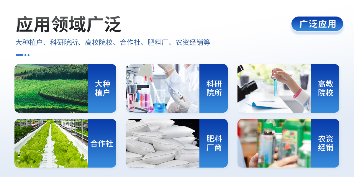 | 1、土壤養(yǎng)分: ●土壤總有機碳TOC、土壤碳氮比、銨態(tài)氮、土壤有效磷、土壤速效鉀、土壤硝態(tài)氮、土壤水解氮、土壤全氮、土壤全磷、土壤全鉀、土壤有機質(zhì)(丘林法)、土壤有機質(zhì)(浸提法)、PH值、含鹽量、水分。 ●土壤中微量元素:土壤鈣、土壤鎂、土壤硫、土壤硅、土壤硼、土壤鐵、土壤銅、土壤錳、土壤鋅、土壤氯; ●土壤重金屬:土壤鉛、土壤砷、土壤鎘、土壤鉻、土壤汞。 | 2、肥料養(yǎng)分: ●有機肥總有機碳TOC、有機肥碳氮比、全氮、有機肥全磷、有機肥全鉀、有機肥硝態(tài)氮、有機肥速效磷、有機肥速效鉀、有機肥酸解氮、有機質(zhì); ●復(fù)合肥碳氮比、全氮、復(fù)合肥全磷、復(fù)合肥全鉀; ●水溶肥碳氮比、全氮、水溶肥全磷、水溶肥全鉀; ●葉面肥碳氮比、全氮、葉面肥全磷、葉面肥全鉀; ●水溶性腐植酸(風化煤)、水溶性腐植酸(褐煤)、水溶性腐植酸(泥炭)、游離態(tài)腐植酸(風化煤)、游離態(tài)腐植酸(褐煤)、游離態(tài)腐植酸(泥炭); ●單質(zhì)肥:氮肥中銨態(tài)氮、肥料硝態(tài)氮、尿素氮、縮二脲、磷肥中磷、磷肥中水溶性磷、鉀肥中鉀; ●各種肥料微量元素:肥料鈣、肥料鎂、肥料硫、肥料硅、肥料硼、肥料鐵、肥料銅、肥料錳、肥料鋅、肥料氯; ●肥料重金屬:肥料鉛、肥料砷、肥料鎘、肥料鉻、肥料汞。 |