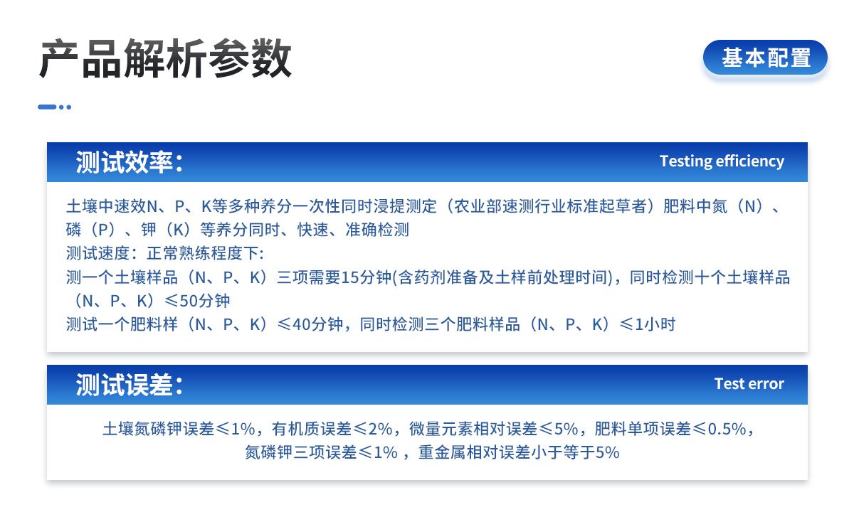 | 土壤中速效N、P、K等多種養(yǎng)分一次性同時浸提測定(農(nóng)業(yè)部速測行業(yè)標準起草者)。 | 肥料中氮(N)、磷(P)、鉀(K)等養(yǎng)分同時、快速、準確檢測。 | 測試速度:正常熟練程度下: | 測一個土壤樣品(N、P、K)三項需要20分鐘(含藥劑準備及土樣前處理時間),同時檢測三個土壤樣品(N、P、K)≤40分鐘,同時測8個土樣≤1小時。 | 測試一個肥料樣(N、P、K)≤50分鐘,同時檢測三個肥料樣品(N、P、K)≤1.5小時。 |