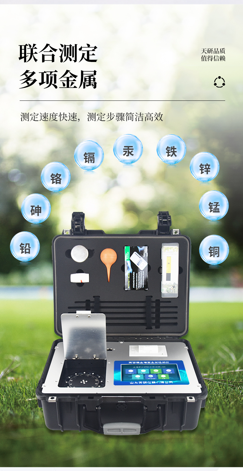 可對(duì)土壤、肥料、作物、蔬菜、水果、水質(zhì)、食品等樣品中的砷、鉛、鎘、鉻、汞、鐵、鋁、鋅、錳、銅等進(jìn)行快速聯(lián)合測(cè)定。