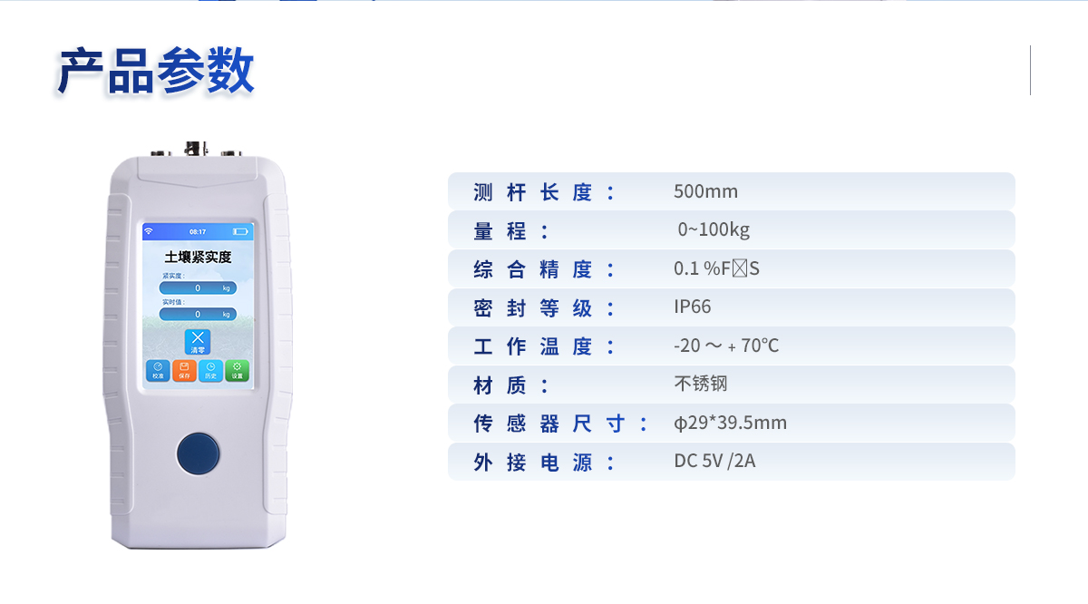 土壤緊實(shí)度又叫土壤硬度或土壤堅(jiān)實(shí)度或土壤穿透阻力。一般用金屬柱塞或探針壓入土壤時(shí)的阻力表示(單位為Pa)。土壤緊實(shí)度是指土壤抵抗外力的壓實(shí)和破碎的能力,是土壤性質(zhì)的其中一個(gè)方面。另外,土壤物理性包括土壤質(zhì)地、結(jié)構(gòu)、孔隙性等,涉及到土壤的堅(jiān)實(shí)度、塑性、通透性、排水、蓄水能力、根系穿透的難易等。