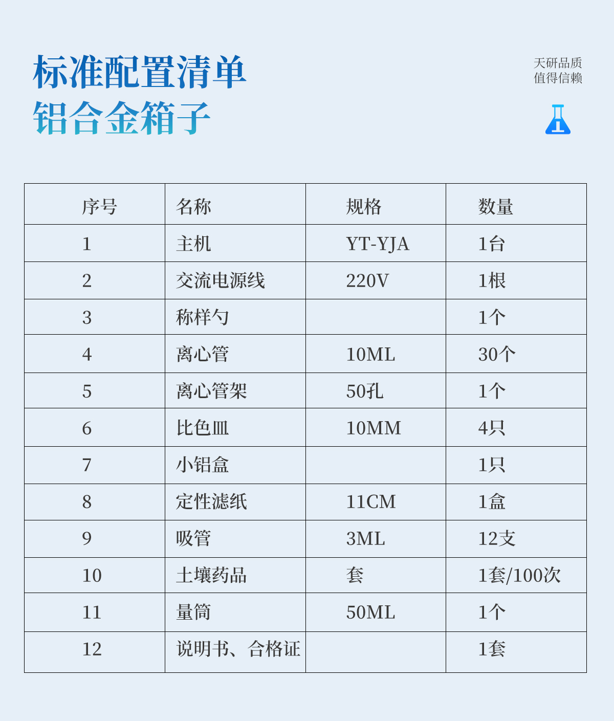 | 名稱 | 主機(jī) | 交流電源線 | 稱樣勺 | 離心管 | 離心管架 | 比色皿 | 小鋁盒 | 定性濾紙 | 吸管 | 土壤藥品 | 量筒 | 說明書、合格證 |