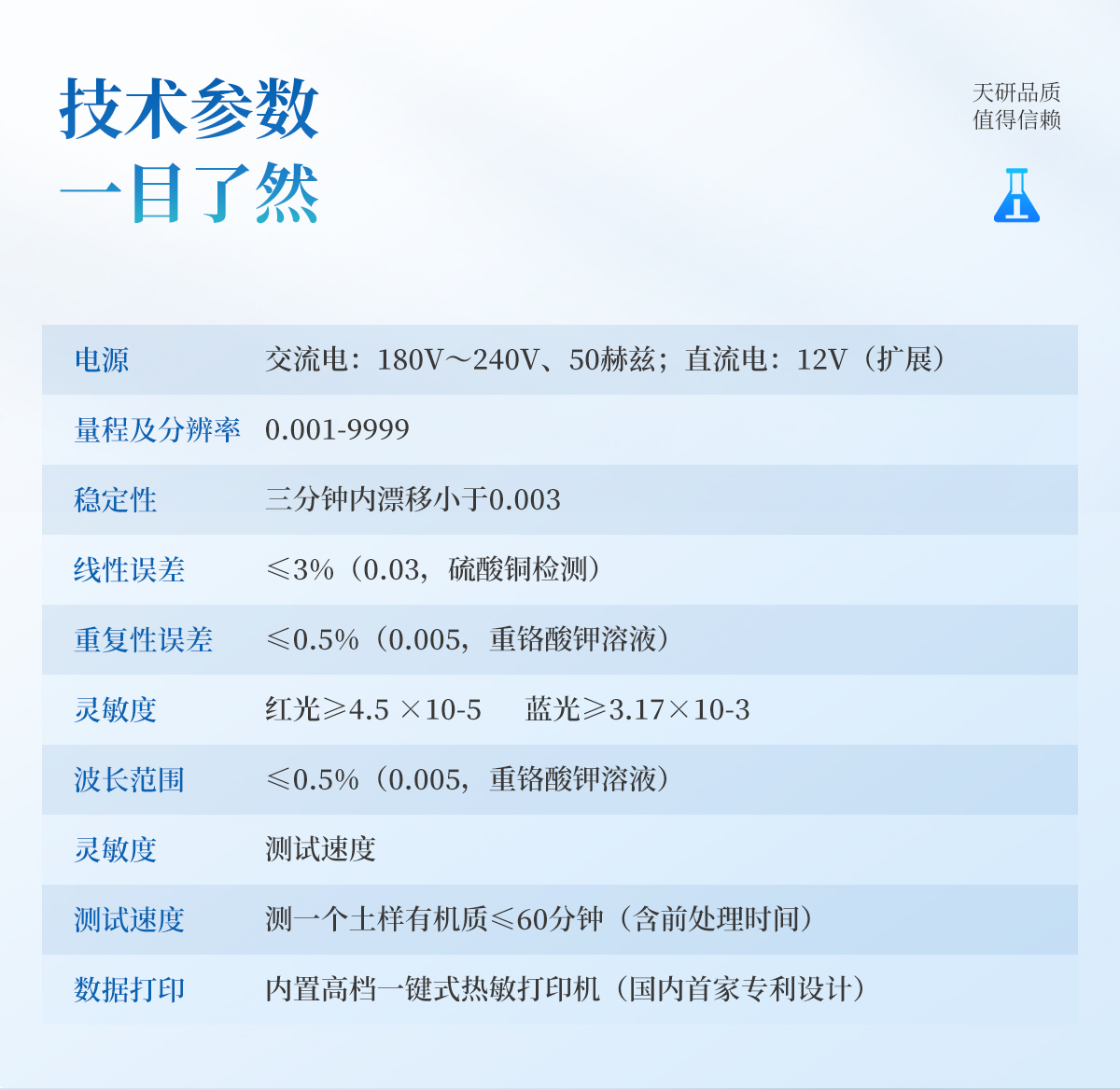 | 電源:交流電:180V~240V、50赫茲;直流電:12V(擴(kuò)展) | 量程及分辨率:0.001-9999 | 穩(wěn)定性:三分鐘內(nèi)漂移小于0.003 | 線性誤差:≤3%(0.03,硫酸銅檢測) | 重復(fù)性誤差:≤0.5%(0.005,重鉻酸鉀溶液) | 靈敏度:紅光≥4.5 ×10-5 藍(lán)光≥3.17×10-3 | 波長范圍:紅光620±8nm 藍(lán)光440±8nm | 測試速度:測一個土樣有機(jī)質(zhì)≤60分鐘(含前處理時間) | 可同時檢測8個土樣≤個小時(含前處理時間) | 數(shù)據(jù)打印:內(nèi)置高檔一鍵式熱敏打印機(jī)(國內(nèi)首家**設(shè)計) |