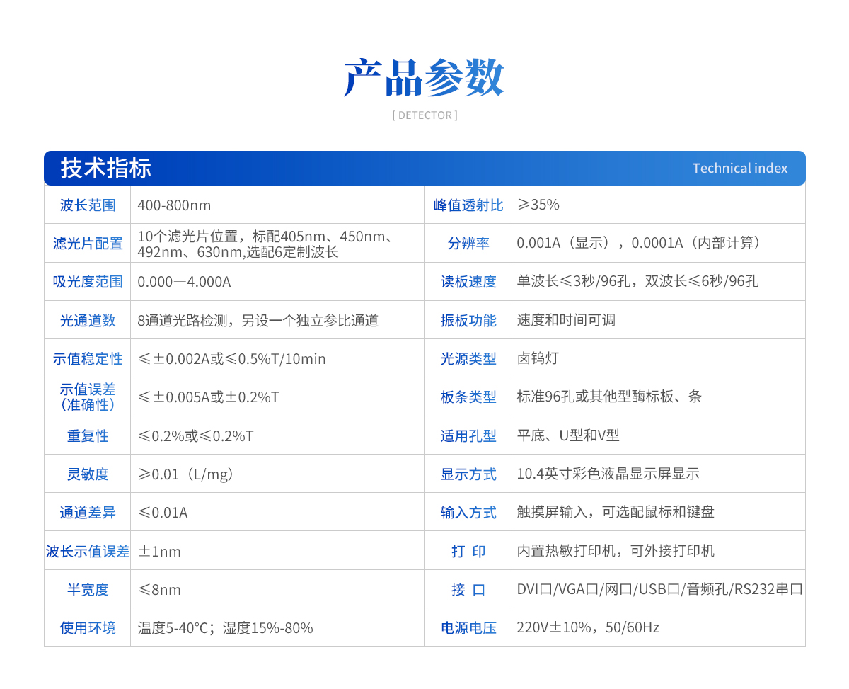波長范圍: 400-800nm 濾光片配置:10個濾光片位置,標配405nm、450nm、492nm、630nm,選配6定制波長 吸光度范圍:0.000―4.000A 光通道數(shù):8通道光路檢測,另設一個獨立參比通道 示值穩(wěn)定性:≤±0.002A或≤0.5%T/10min 示值誤差(準確性):≤±0.005A或±0.2%T 重復性:≤0.2%或≤0.2%T 靈敏度:≥0.01(L/mg) 通道差異:≤0.01A 波長示值誤差:±1nm 半寬度:≤8nm 峰值透射比:≥35% 分辨率:0.001A(顯示),0.0001A(內(nèi)部計算) 讀板速度:單波長≤3秒/96孔,雙波長≤6秒/96孔 振板功能:速度和時間可調(diào) 光源類型:鹵鎢燈 板條類型:標準96孔或其他型酶標板、條 適用孔型:平底、U型和V型 顯示方式:10.4英寸彩色液晶顯示屏顯示 輸入方式:觸摸屏輸入,可選配鼠標和鍵盤 打印:內(nèi)置熱敏打印機,可外接打印機 接 口:DVI口、VGA口、網(wǎng)口、USB口、音頻孔、RS232串口 使用環(huán)境:溫度5-40℃;濕度15%-80% 電源電壓:220V±10%,50/60Hz 體積:470mm×350mm×210mm(長×寬×高) 重量:11.5Kg |