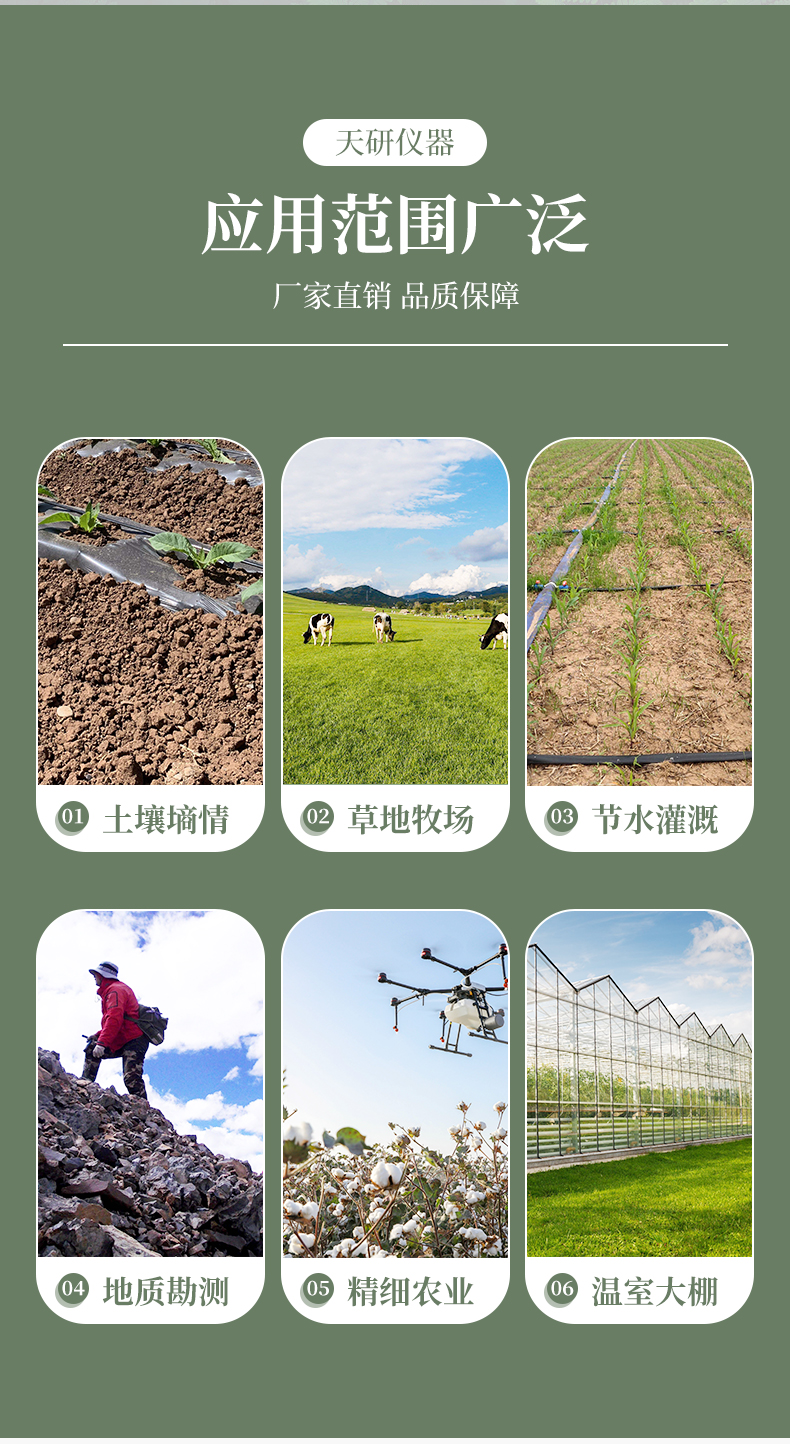 土壤水分溫度鹽分PH測定儀采用一體化結(jié)構(gòu)設(shè)計,可快速準確測量土壤中含水量、溫度、電導(dǎo)率(鹽分)、酸堿度,可對多處樣地、不同土壤深度的水分含量溫度鹽分和PH進行快速檢測和長期連續(xù)監(jiān)測。廣泛應(yīng)用于土壤墑情檢測、旱作節(jié)水灌溉、精細農(nóng)業(yè)、林業(yè)、地質(zhì)勘探、植物培育、水利、環(huán)保等領(lǐng)域。