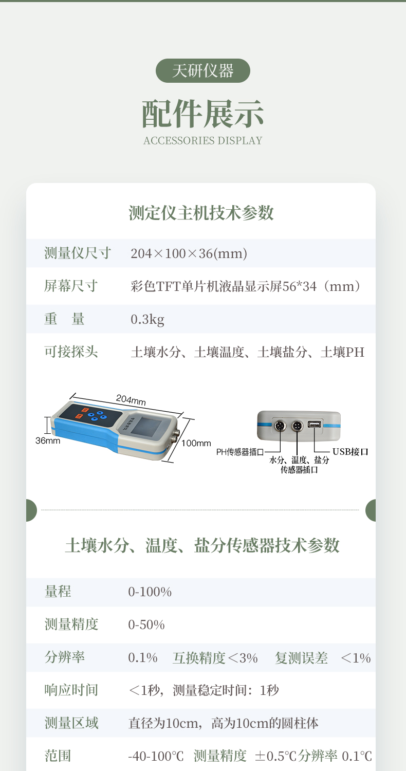 | 測量參數(shù):土壤容積含水量; 單位:%(m3/m3); 測試靈敏度:±0.01 %(m3/m3); | 量程:0-100%(m3/m3) 測量精度:0-50%(m3/m3)范圍內(nèi))±2%(m3/m3); | 50-100%(m3/m3)范圍內(nèi))±3%(m3/m3); 分辨率:0.1% | 土壤溫度范圍:-40-120℃ 測量精度:±0.2℃ 分辨率:±0.1℃ | 土壤鹽分范圍:0-20ms 測量精度:±2% 分辨率:±0.1ms | PH測量范圍:0-14 分辨率:0.1 測量精度:±0.2% | 集成電極:土壤水分,土壤溫度,土壤鹽分三合一,集成到一個傳感器; | ph復(fù)合電極:電極為復(fù)合電極,自動溫度補償,測試更穩(wěn)定更準確。 | 儀器尺寸:10×21×3.5cm | 供電方式:鋰電池供電、交流電兩種方式 | 軟件:上位機軟件免費贈送 |
