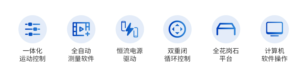 | 儀器基座 | CCD | 鏡頭 | 光柵尺 | 導軌 | 傳動 | 電機 | 運動控制 | 程控光源 | 操縱桿 | 全自動測量軟件 | 加密狗 | 光學校正片 | 電壓 | 計算機 |